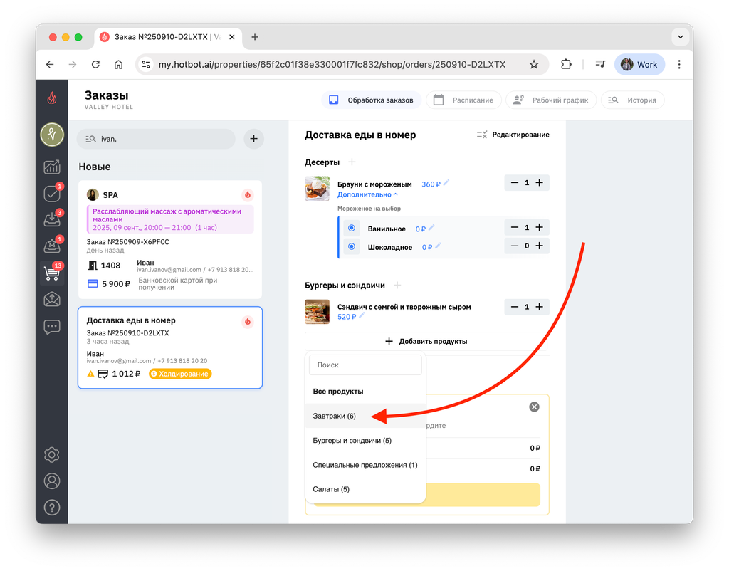 Вы можете дополнять заказ новыми продуктами. Это удобно, если гость вспомнил о дополнительной услуге или решил попробовать что-то еще.