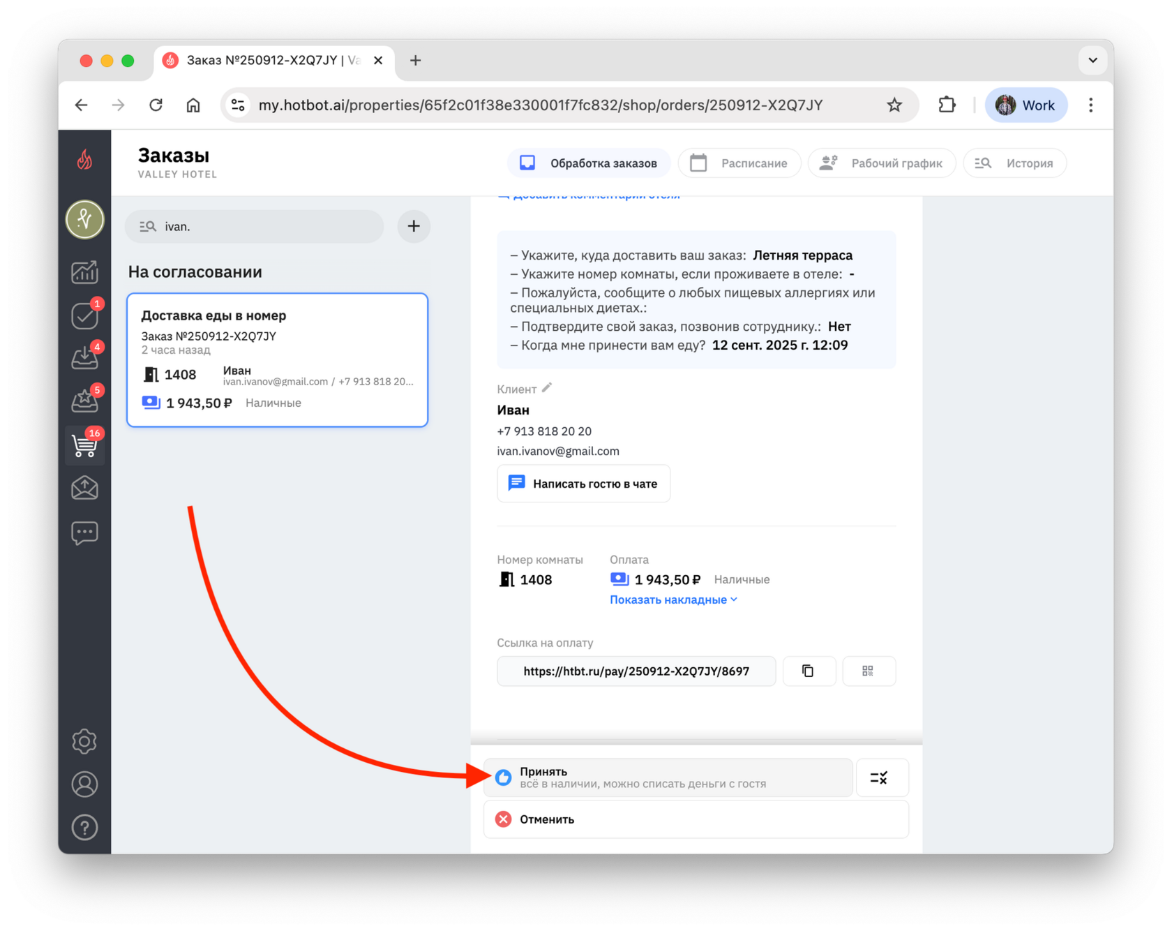 Статус заказа изменился, теперь его можно принять и завершить. Гость внесет оплату офлайн выбранным способом.