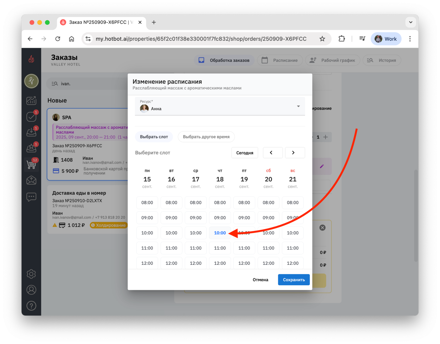 Если заказанная услуга связана с расписанием (шахматка), администратор может перенести ее на другое время или дату.