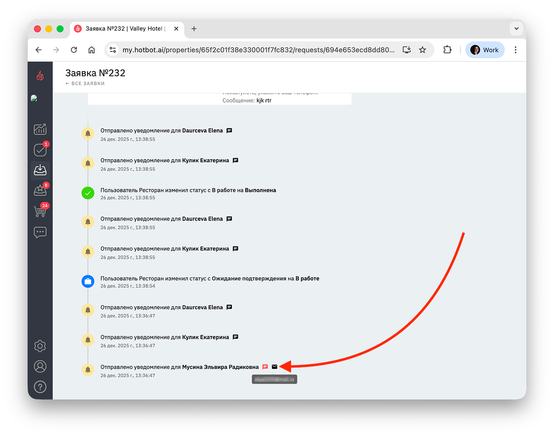 - Детали заявки — здесь отображается само обращение гостя.