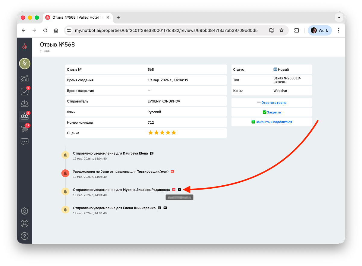 Когда гость оставляет отзыв, сотрудник отеля получает уведомление в личном кабинете Хотбот или в Telegram-боте.