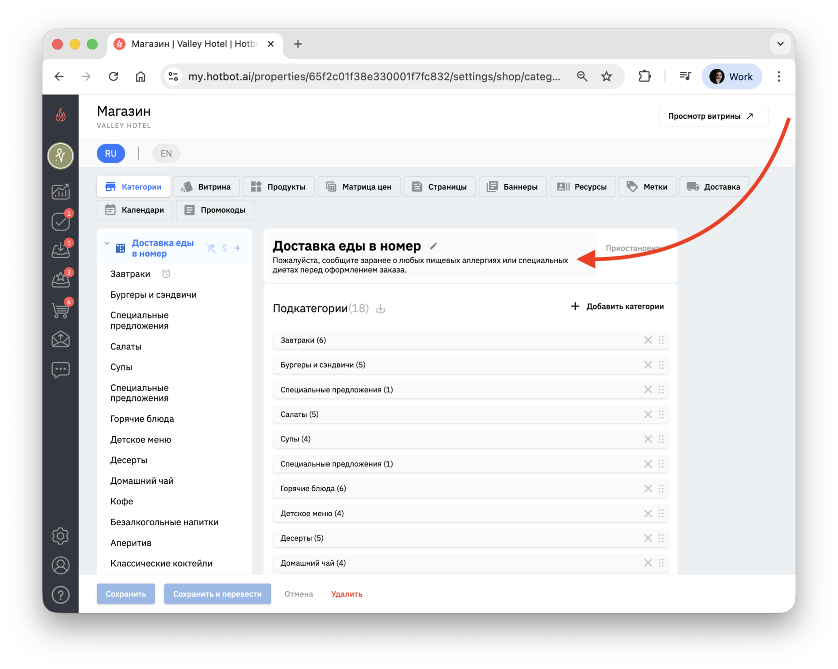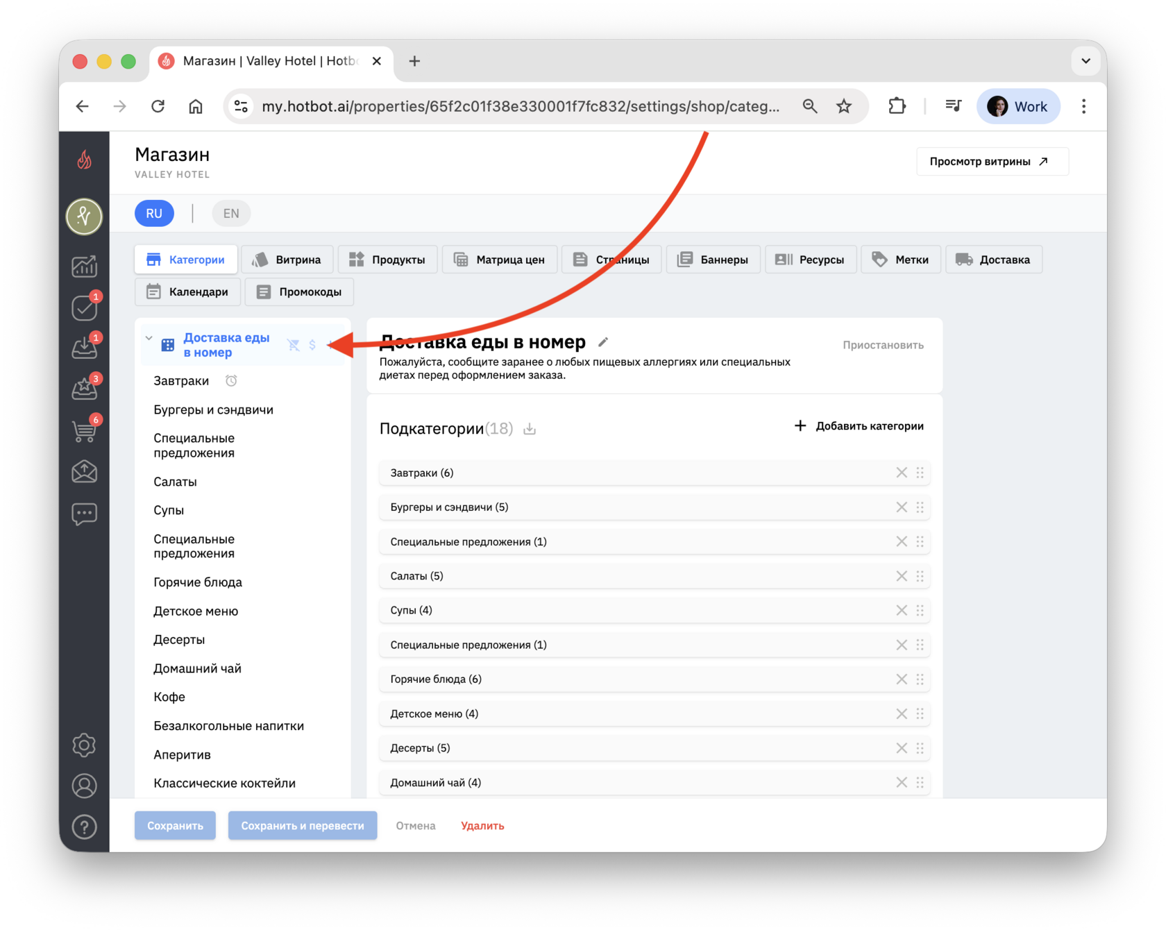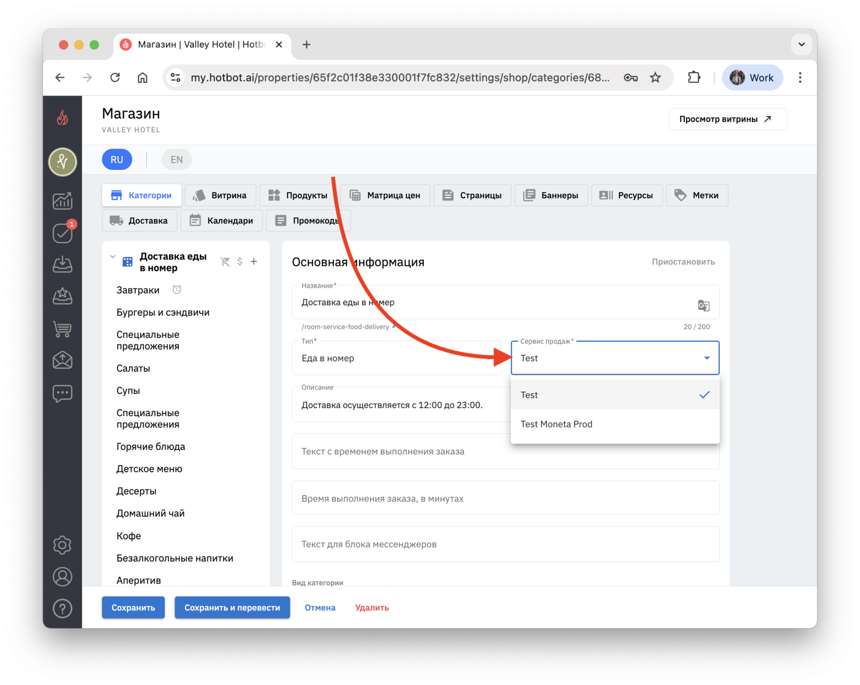 Сервис продаж (СП) — это настройка, которая определяет, какой сервис отеля обрабатывает заказы из категории магазина.