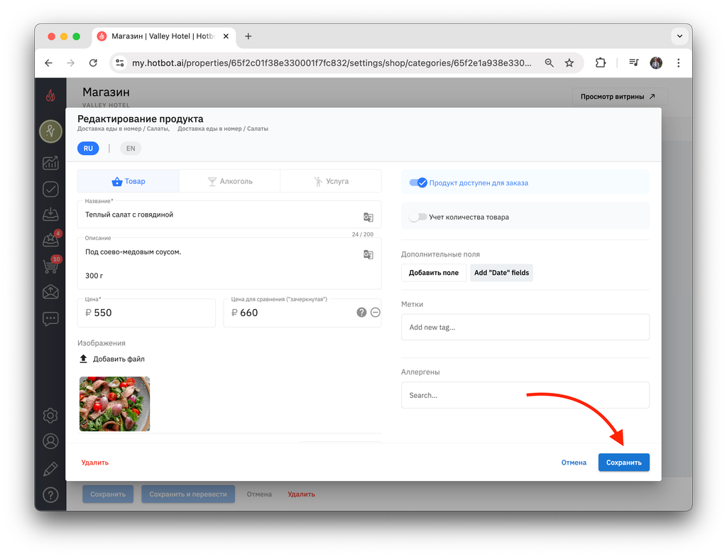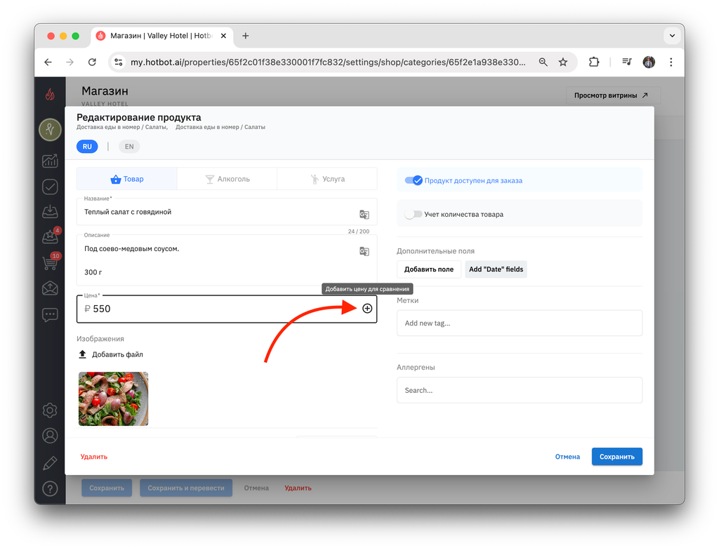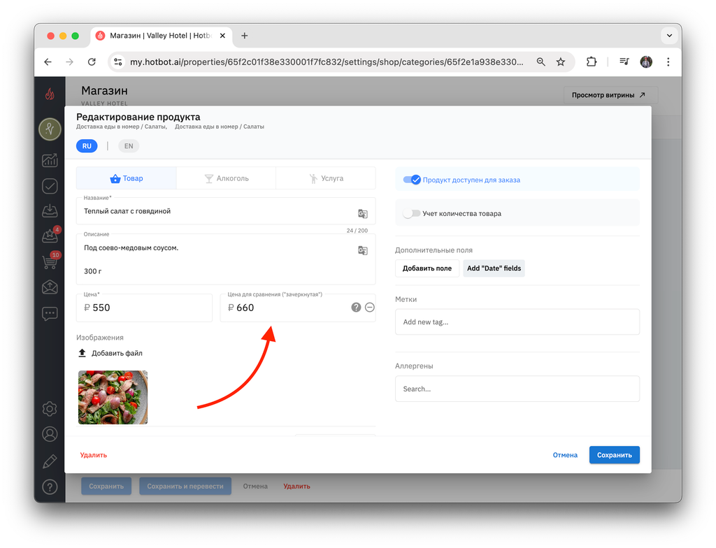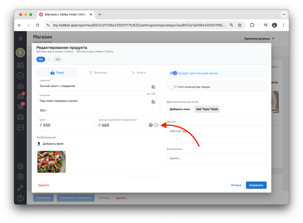 4. В появившемся поле укажите цену для сравнения, которая будет отображаться зачеркнутой (например, 660 р). Обратите внимание: сравнительная цена должна быть выше фактической цены продукта.