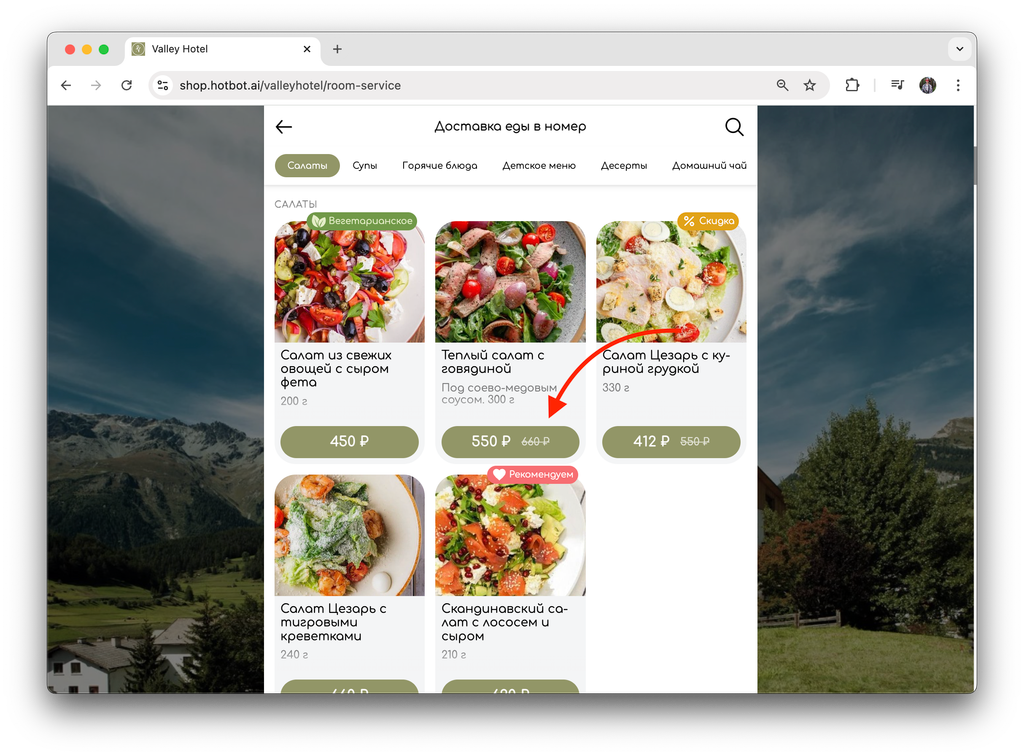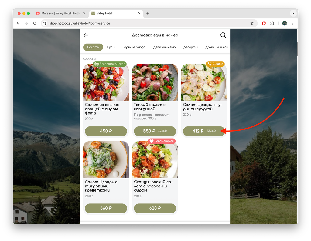 Скидки (зачеркнутая цена) — это инструмент для визуального сравнения прежней и текущей стоимости товара на витрине. Она показывает гостю разницу между этими значениями, акцентируя внимание на выгодном предложении.