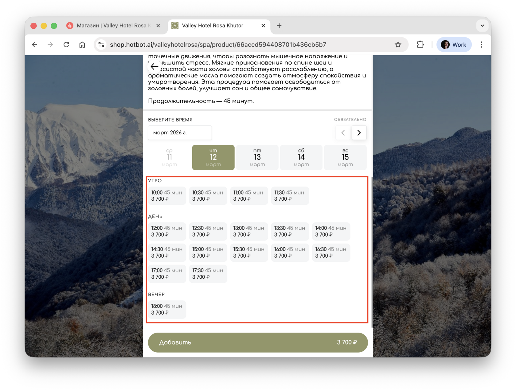 Гость видит стоимость услуги уже на этапе выбора времени — до добавления в корзину.