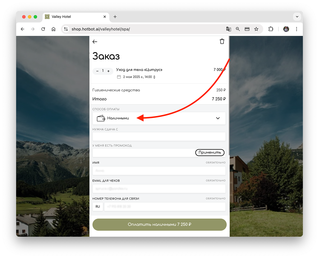 1. Выберите способ оплаты: наличными при получении, картой при получении или записью на номер комнаты.