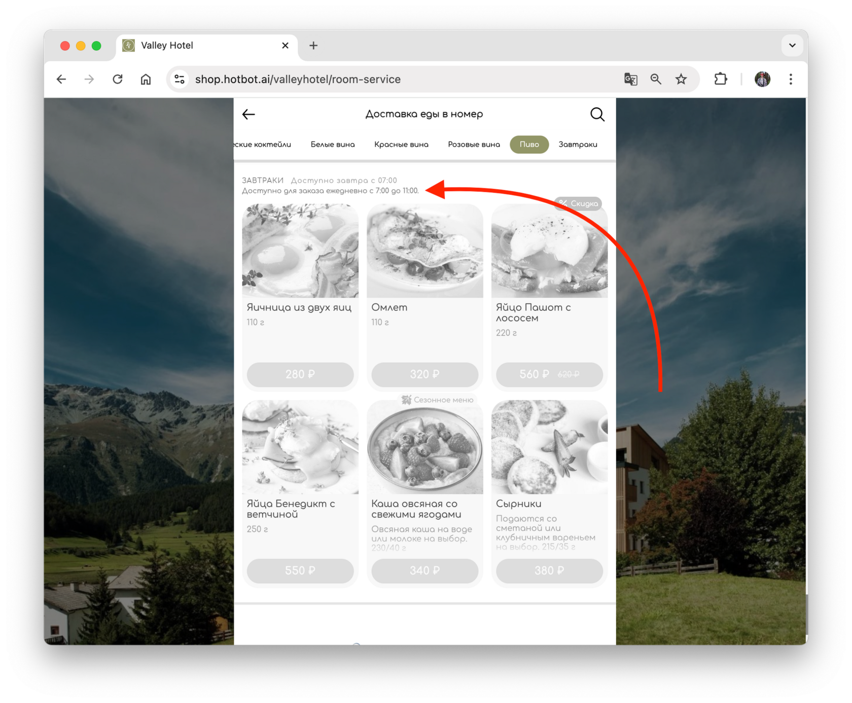 Некоторые товары и услуги доступны для заказа только в определенное время суток. Например, завтраки можно заказать с 7:00 до 11:00.