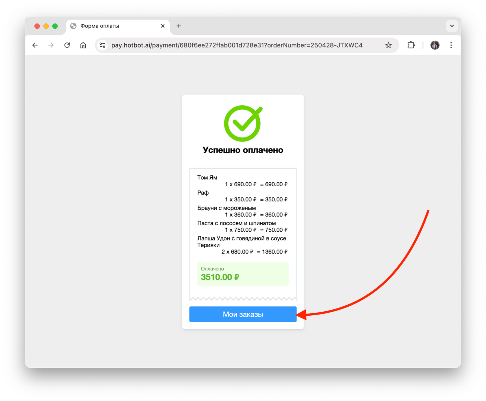 4. Вы увидите вот такой чек с сообщением об успешной оплате. Чтобы проверить статус заказа, нажмите Мои заказы