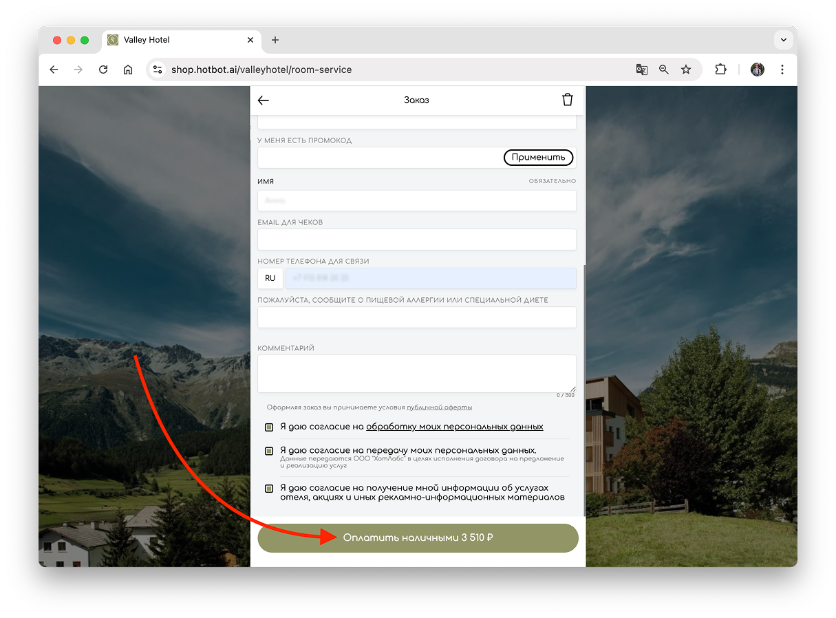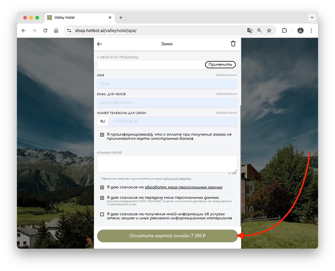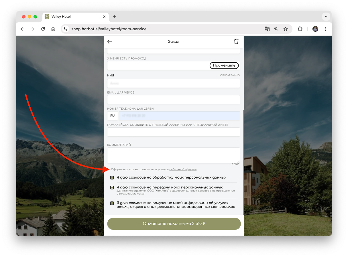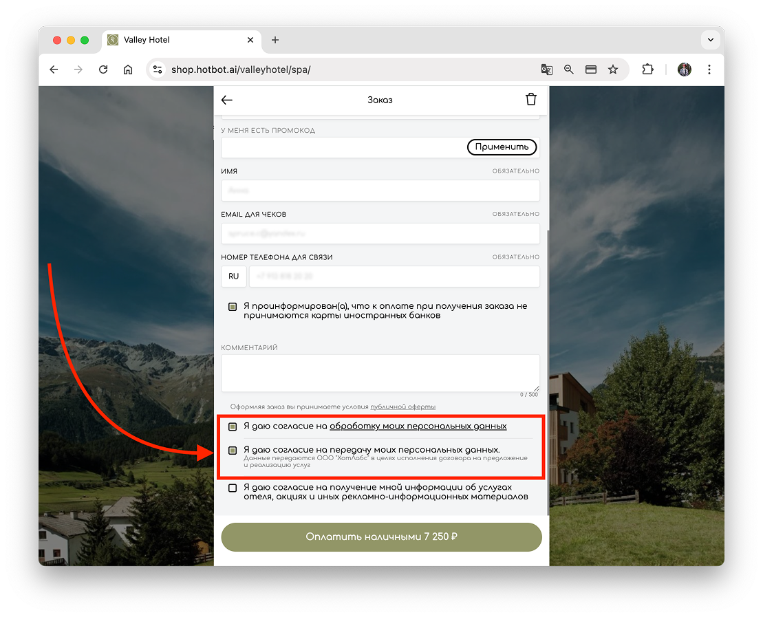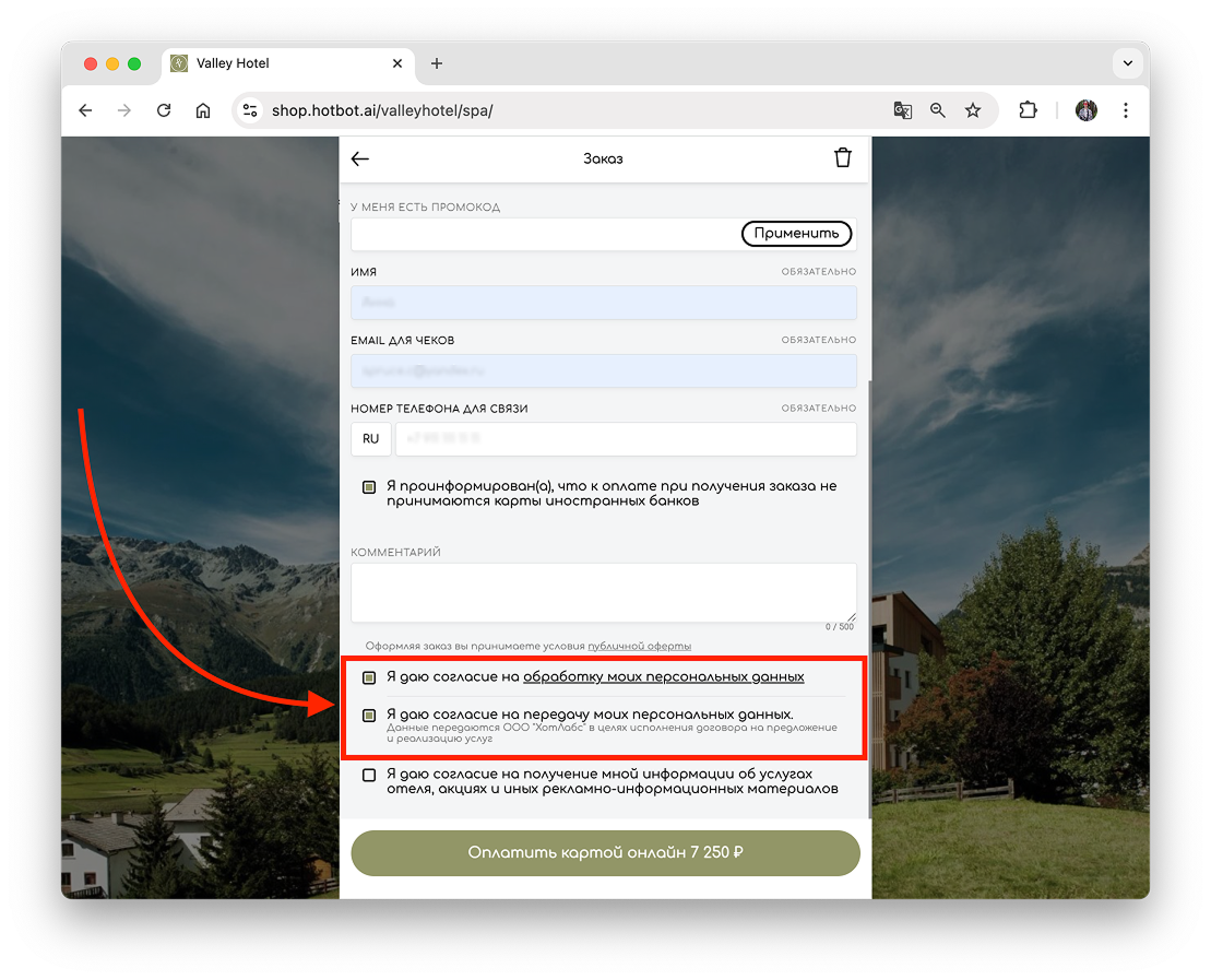 3. Подтвердите согласие на обработку и передачу персональных данных.