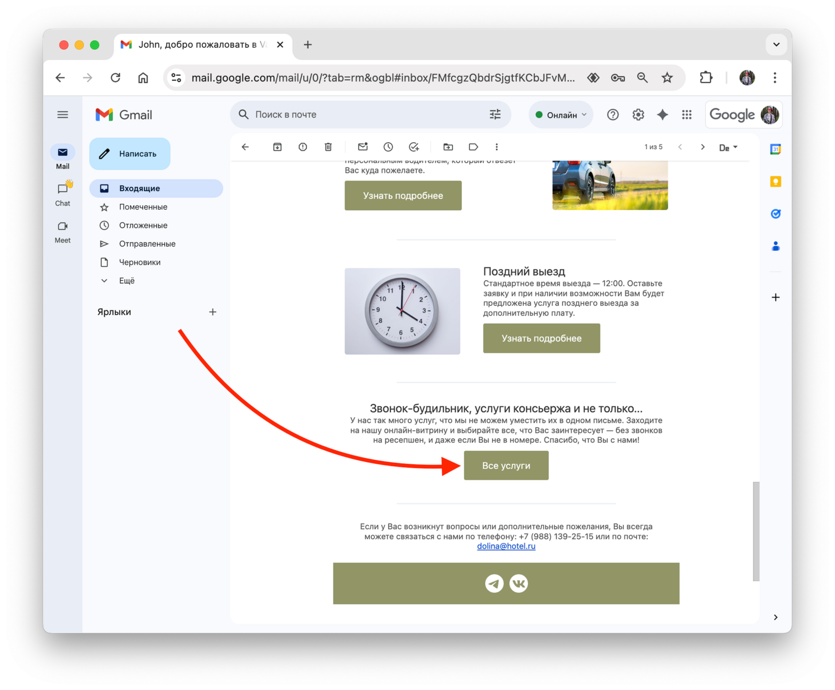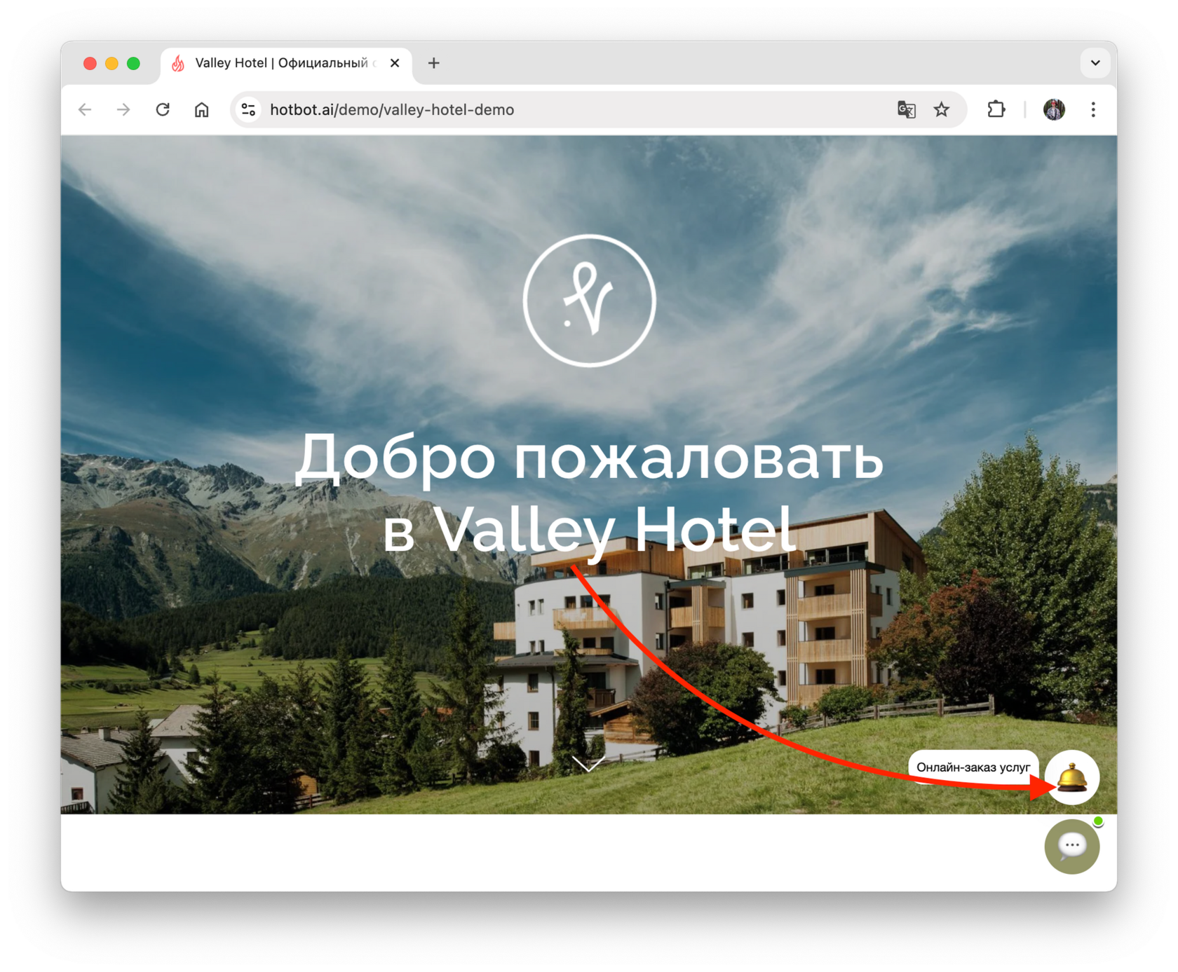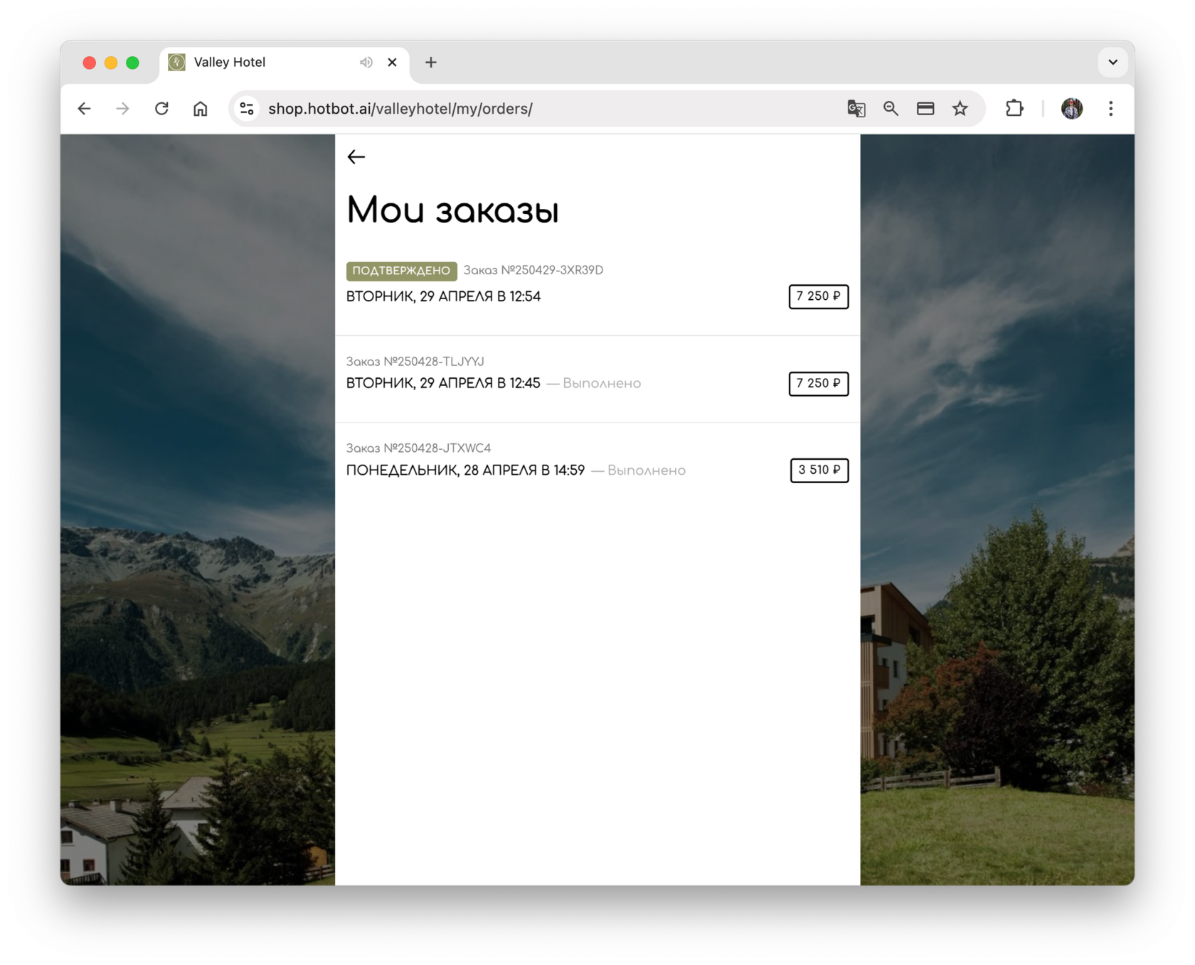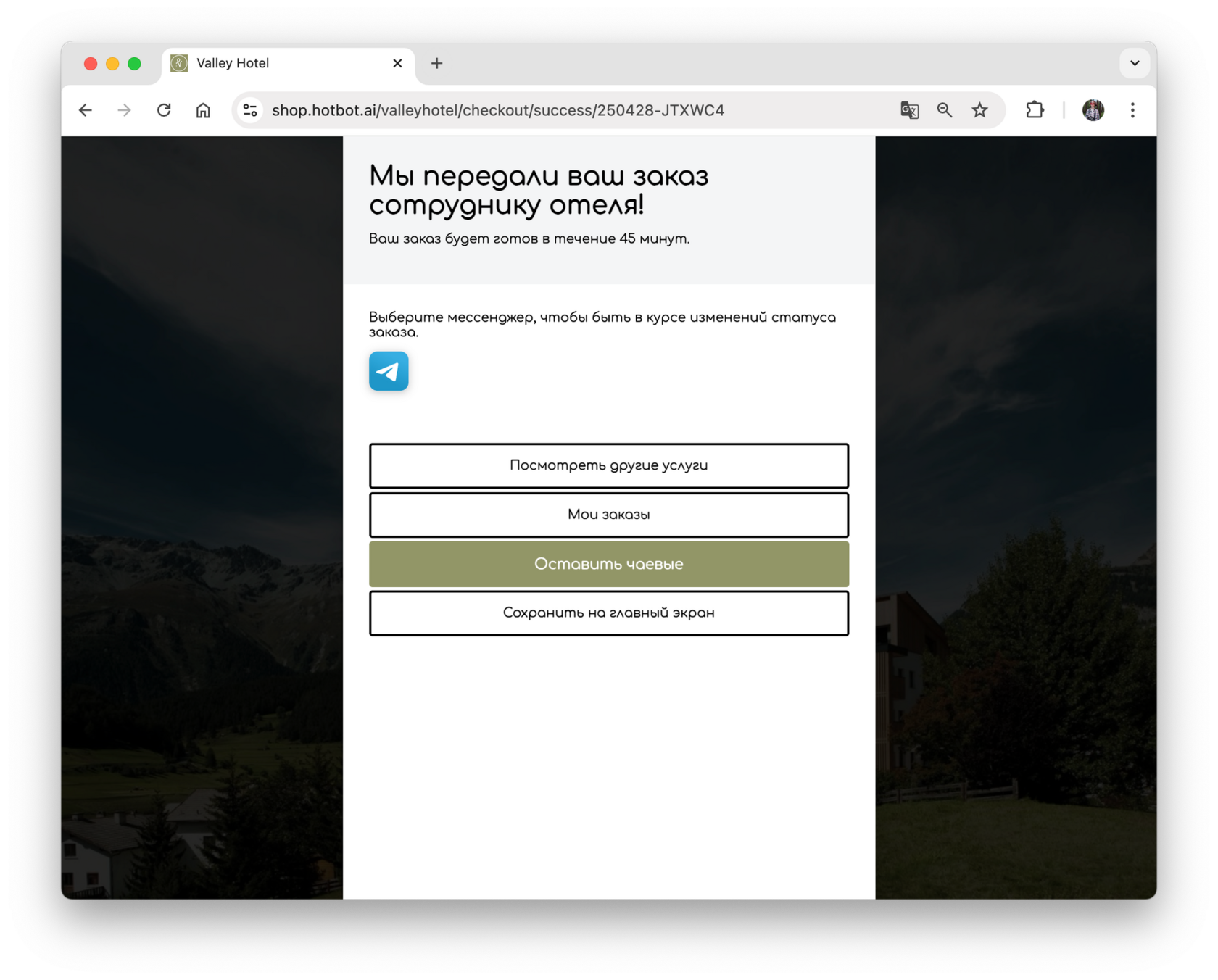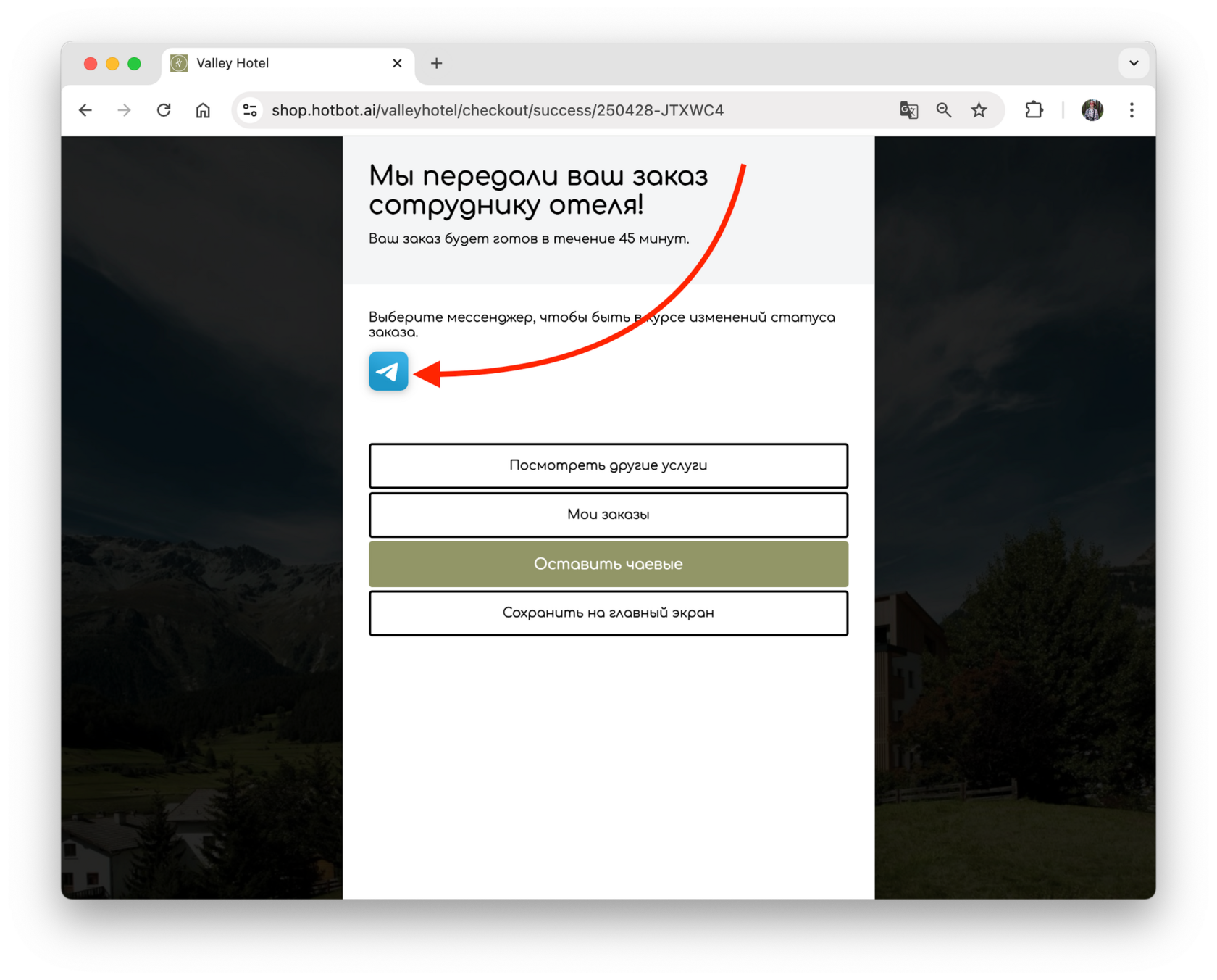 После оформления заказа нажмите на иконку Telegram. Вы перейдете в бот отеля, где сможете отслеживать статус своего заказа и получать уведомления о его готовности.