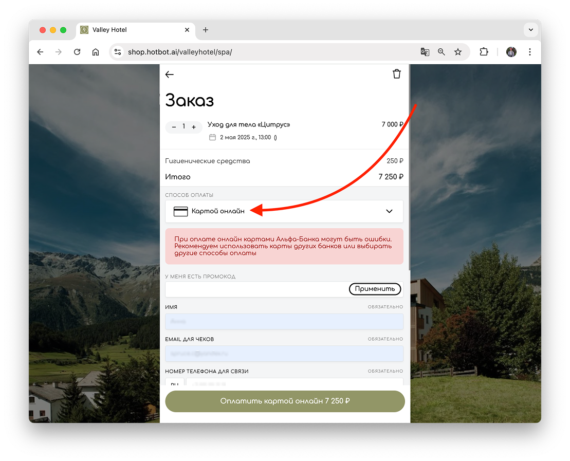 1. Выберите способ оплаты: картой онлайн или через СБП.