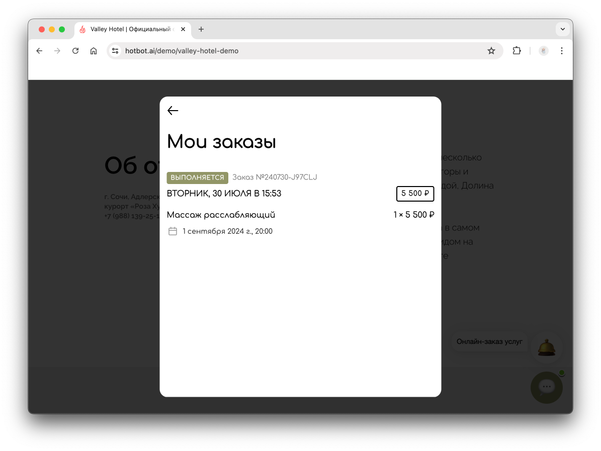 - После подтверждения заказа гость получает сообщение о передаче заказа сотрудникам отеля и возможность отслеживать его статус.