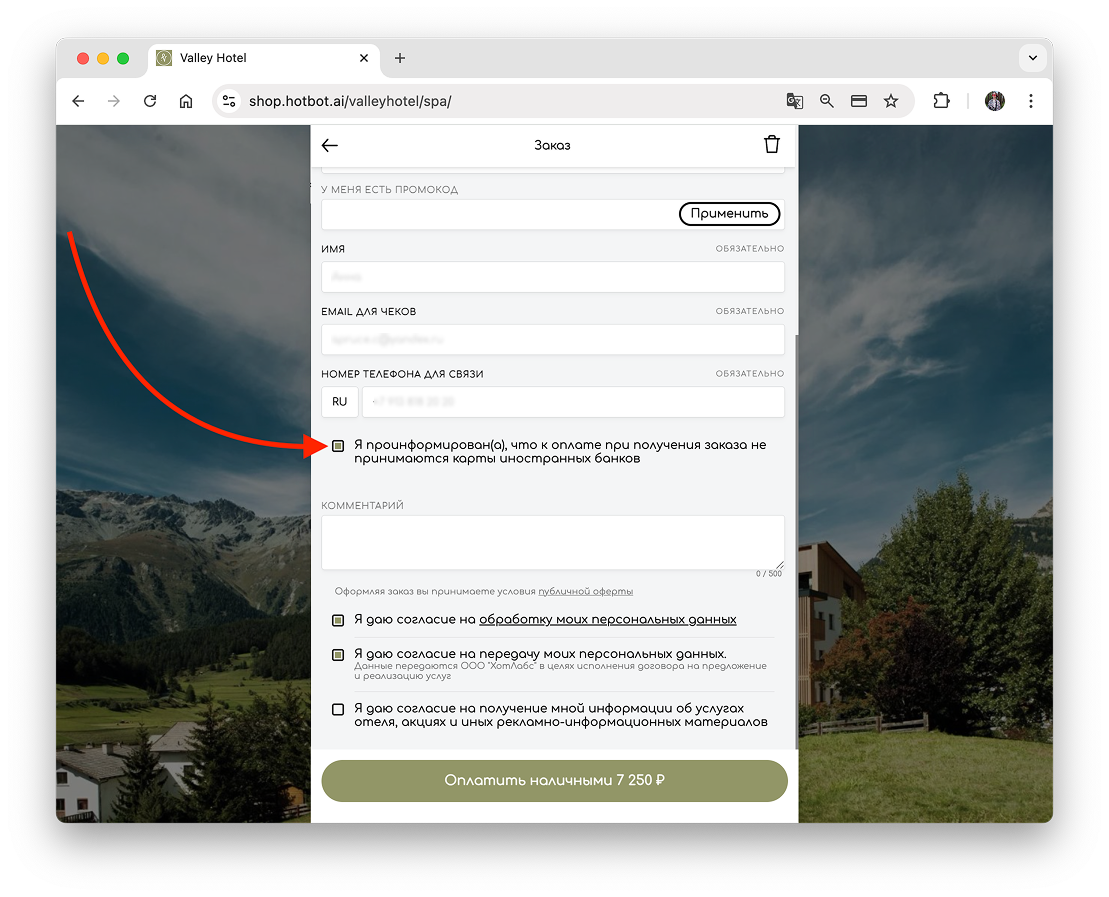 2. Отметьте поле Я проинформирован(а), что к оплате при получении заказа не принимаются карты иностранных банков
