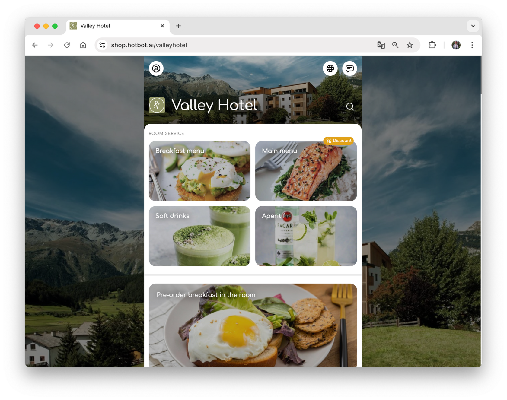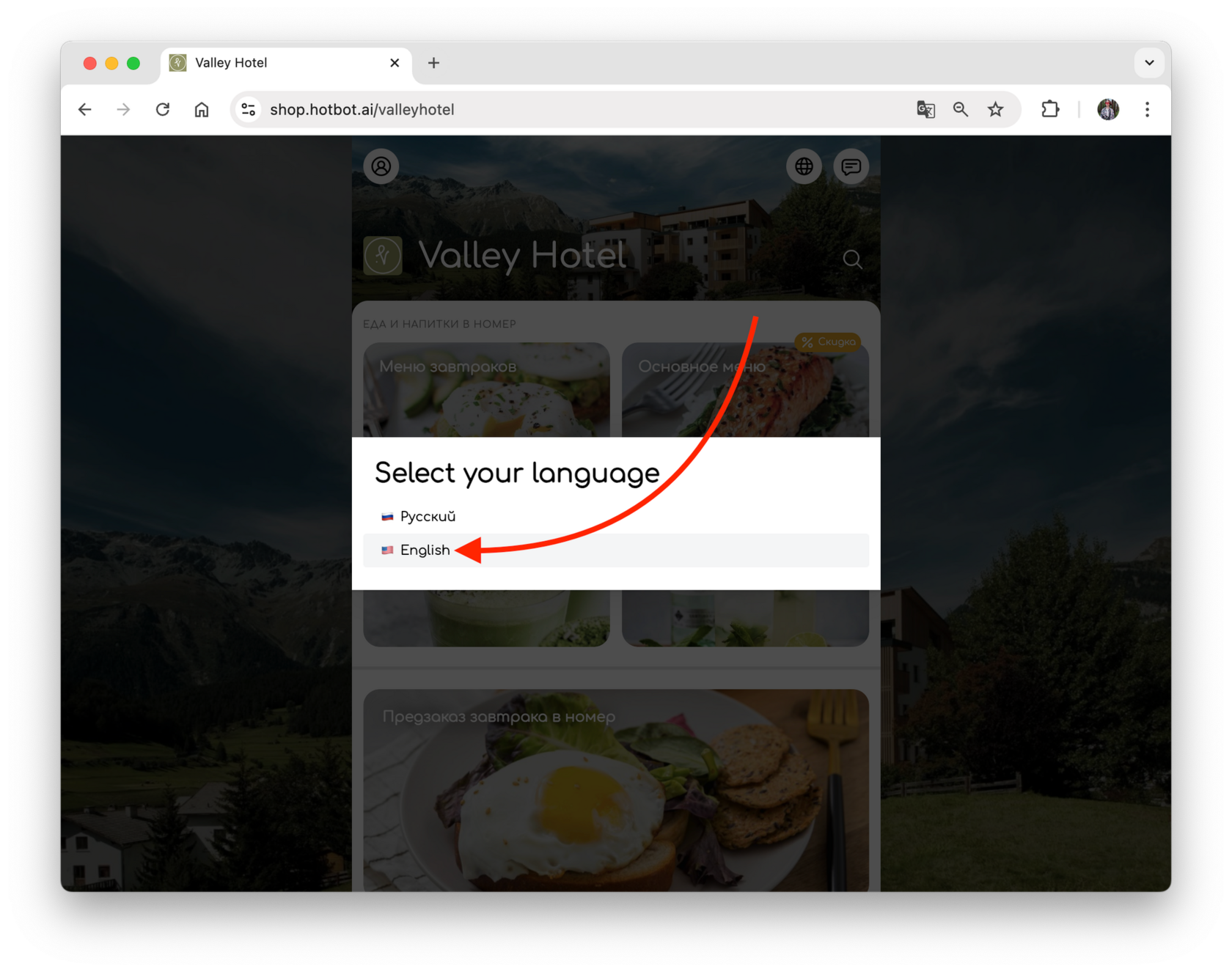 Интерфейс витрины автоматически отображается на языке устройства гостя.