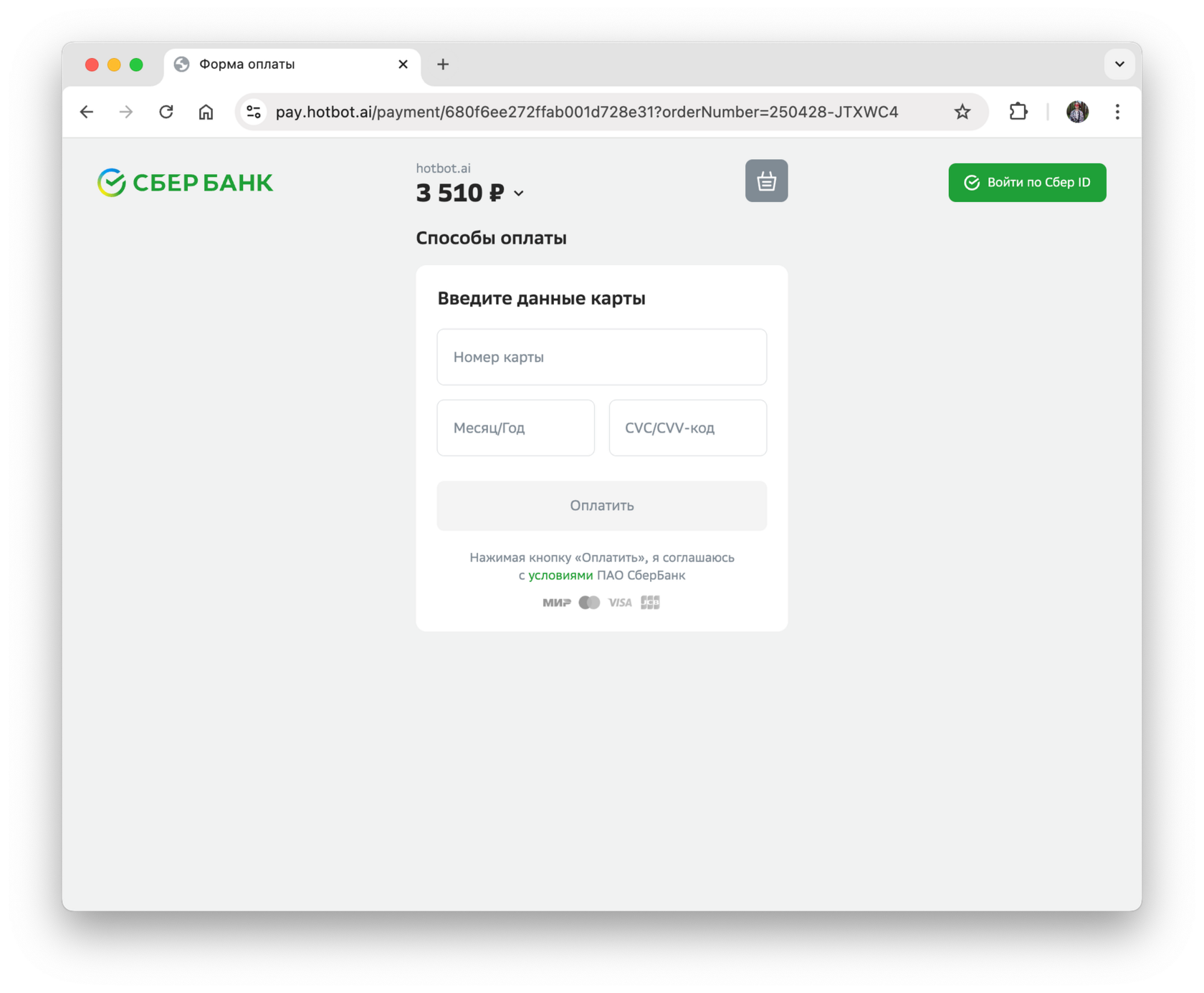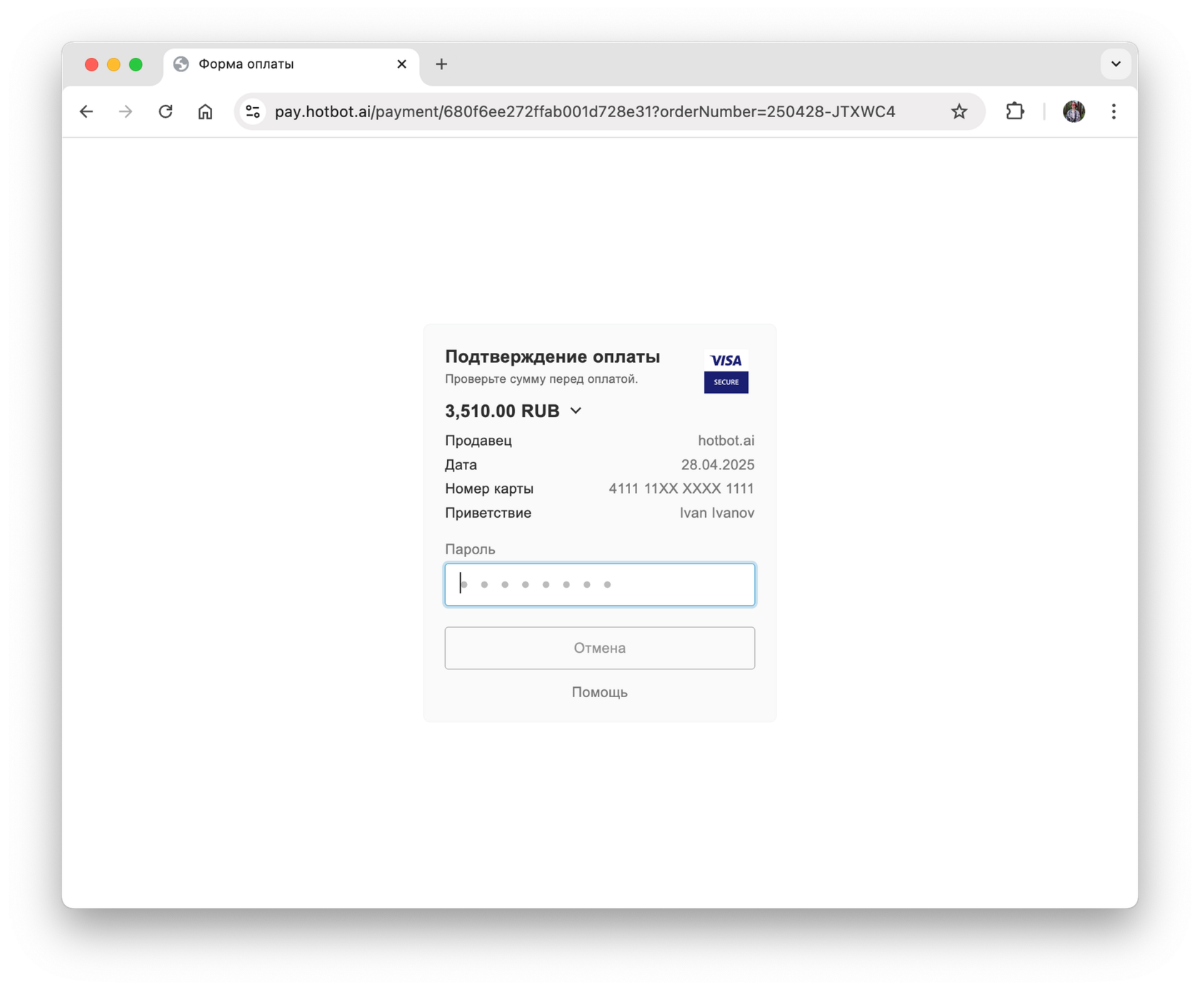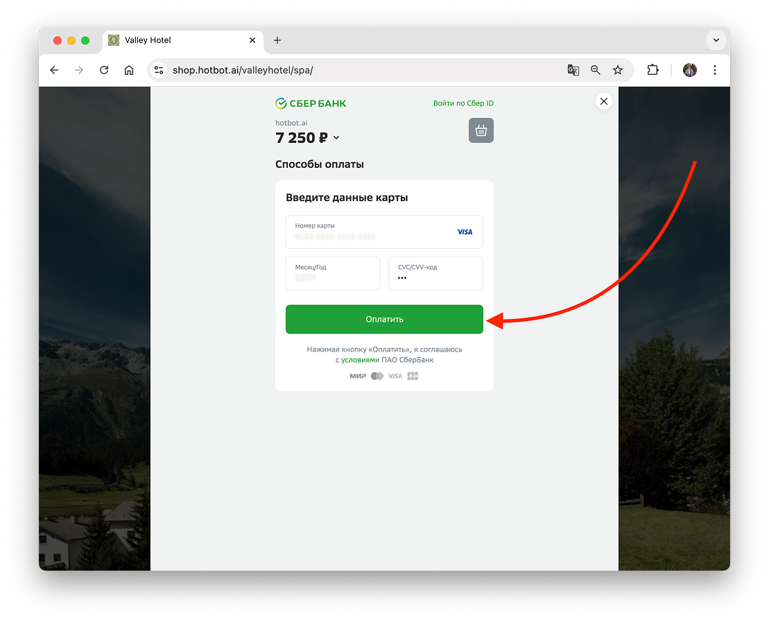 5. В том же окне у вас откроется окно для ввода данных банковской карты. Введите данные карты и подтвердите оплату.