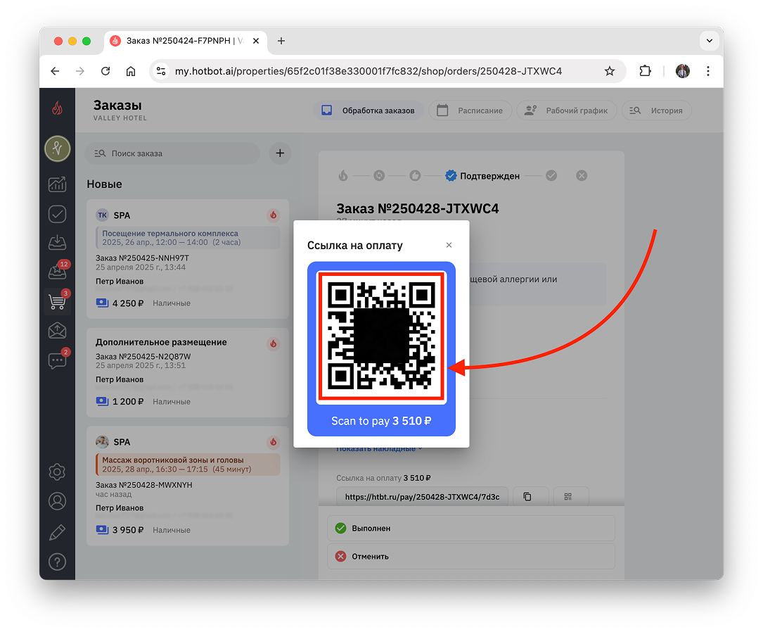 При сканировании QR-кода или переходе по ссылке у гостя откроется окно оплаты.