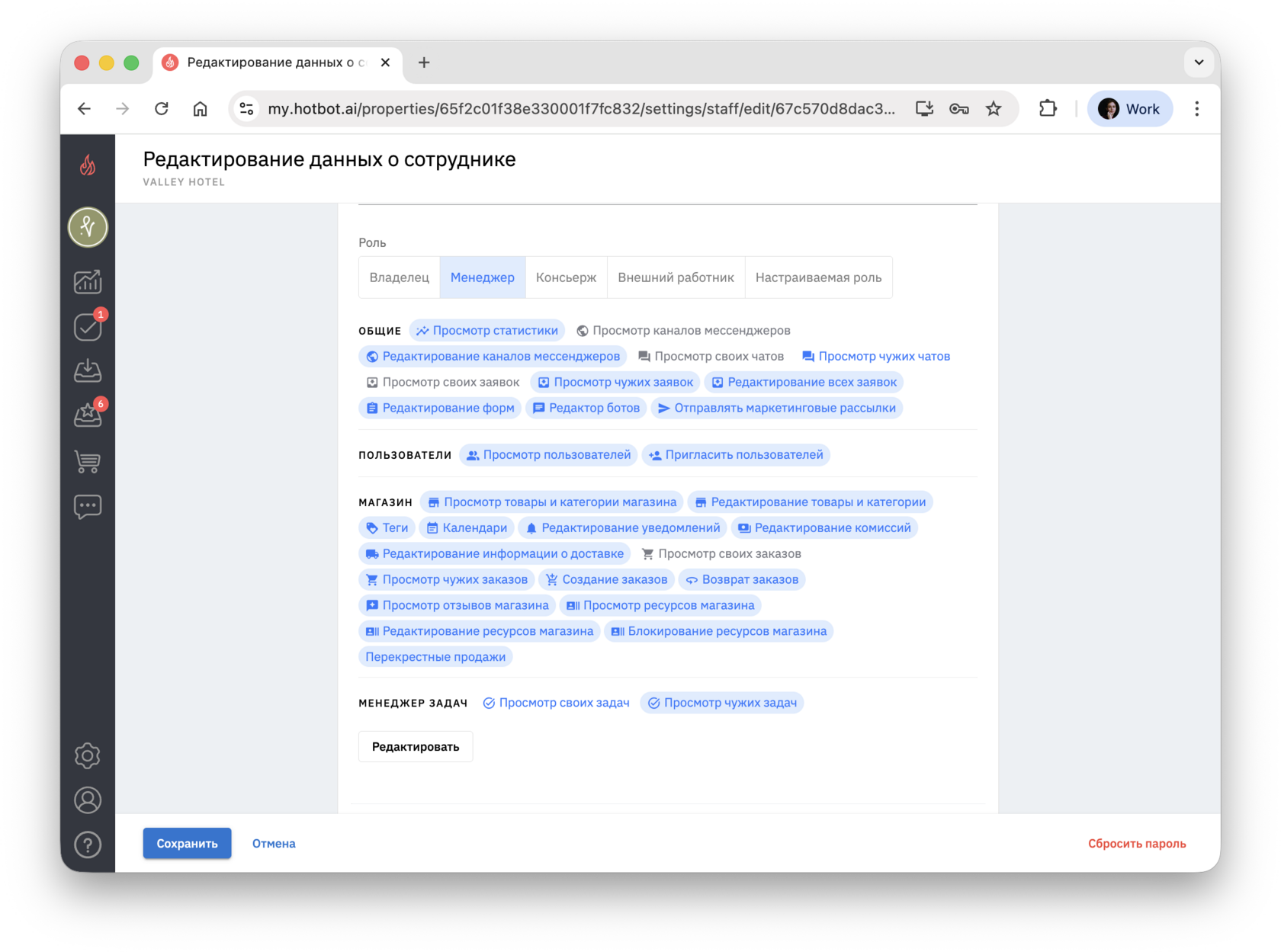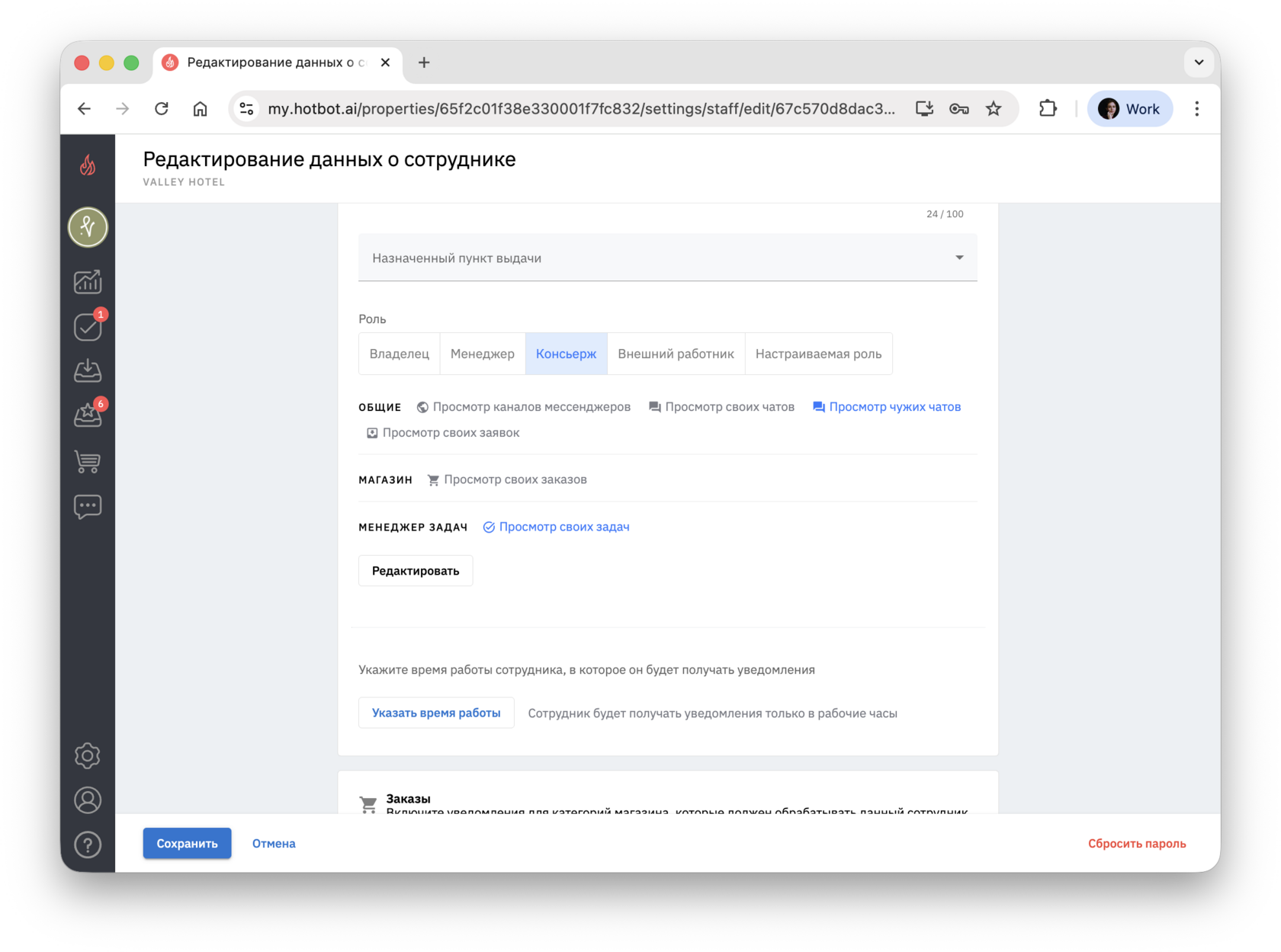- Роль сотрудника. Подробнее о ролях в панели администрирования Хотбот читайте ниже в разделе Настройка сотрудника.