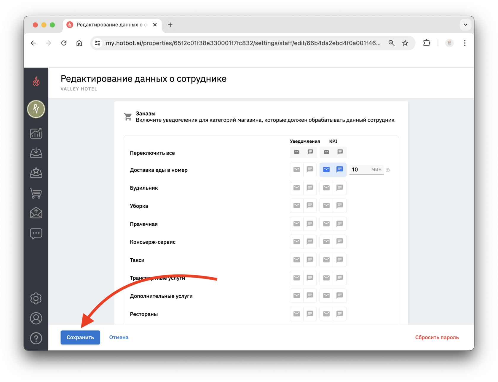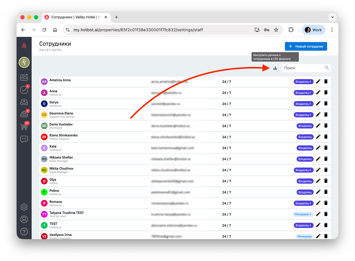 Если у вашего аккаунта нет прав на создание и редактирование сотрудников, вы можете обратиться в службу технической поддержки. Отправьте письмо на support@hotbot.ai или оставьте запрос через форму обратной связи, нажав на кнопку ? в левом нижнем углу личного кабинета.
