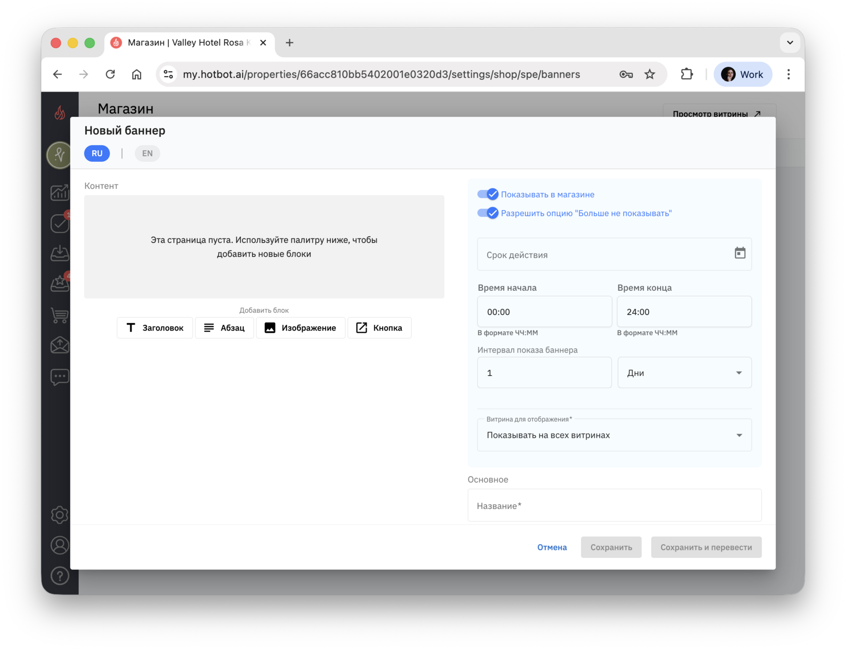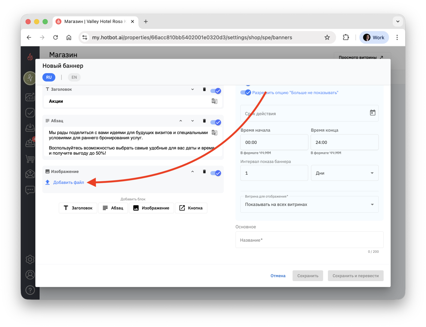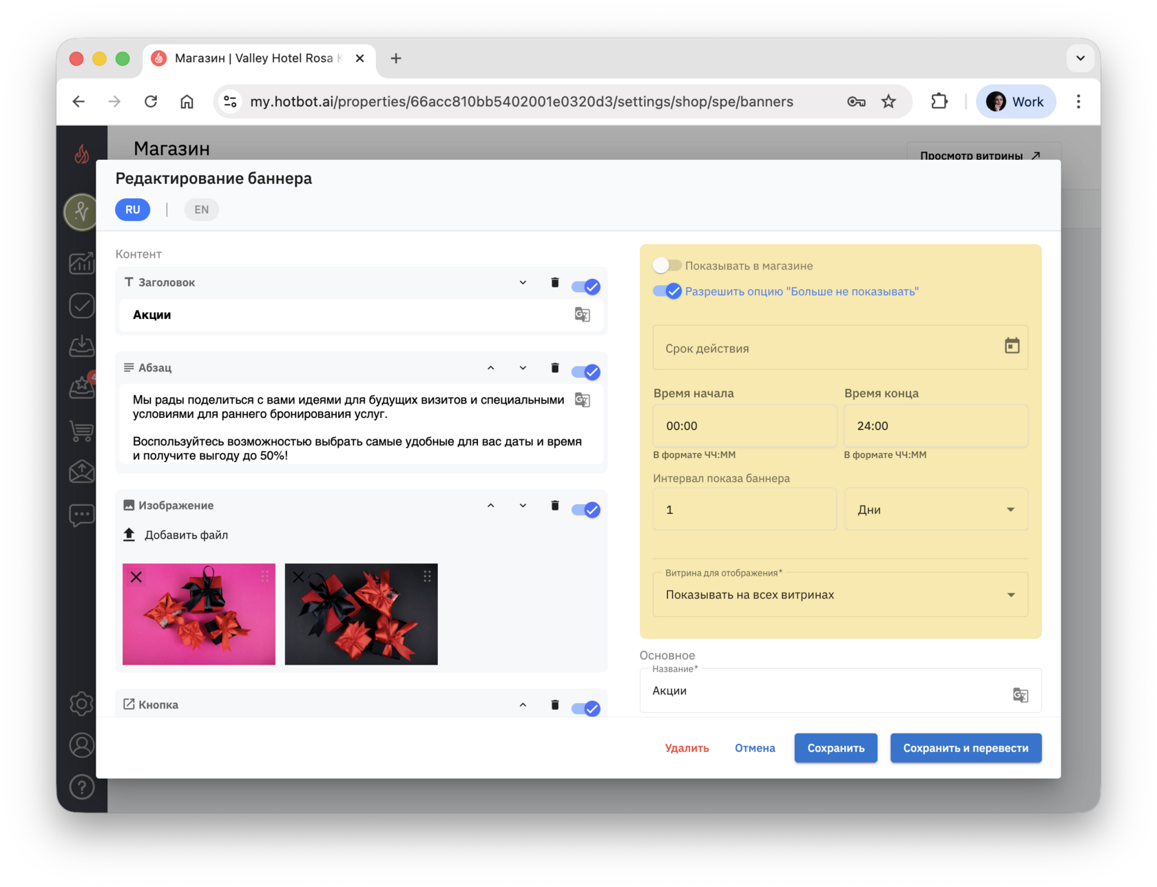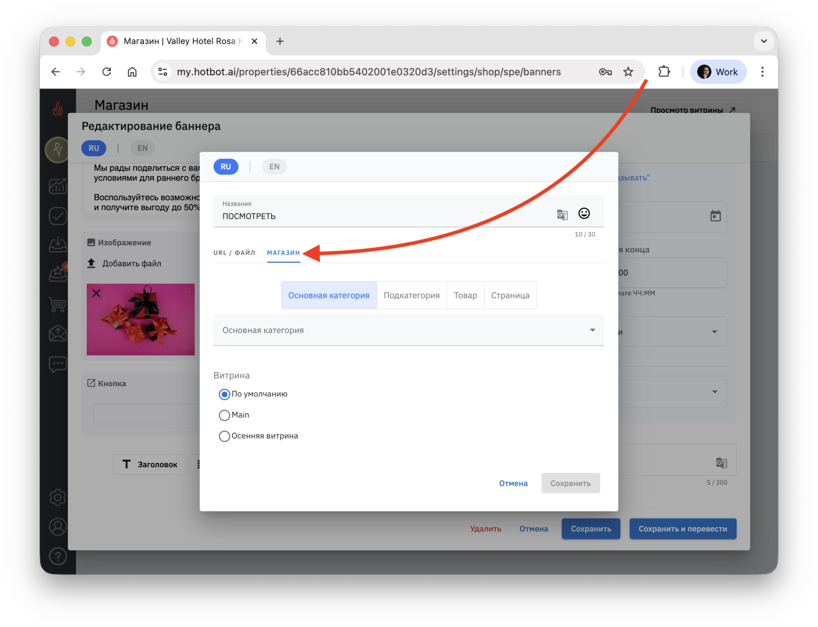 Баннер отображается на любой витрине магазина отеля — основной и дополнительных.