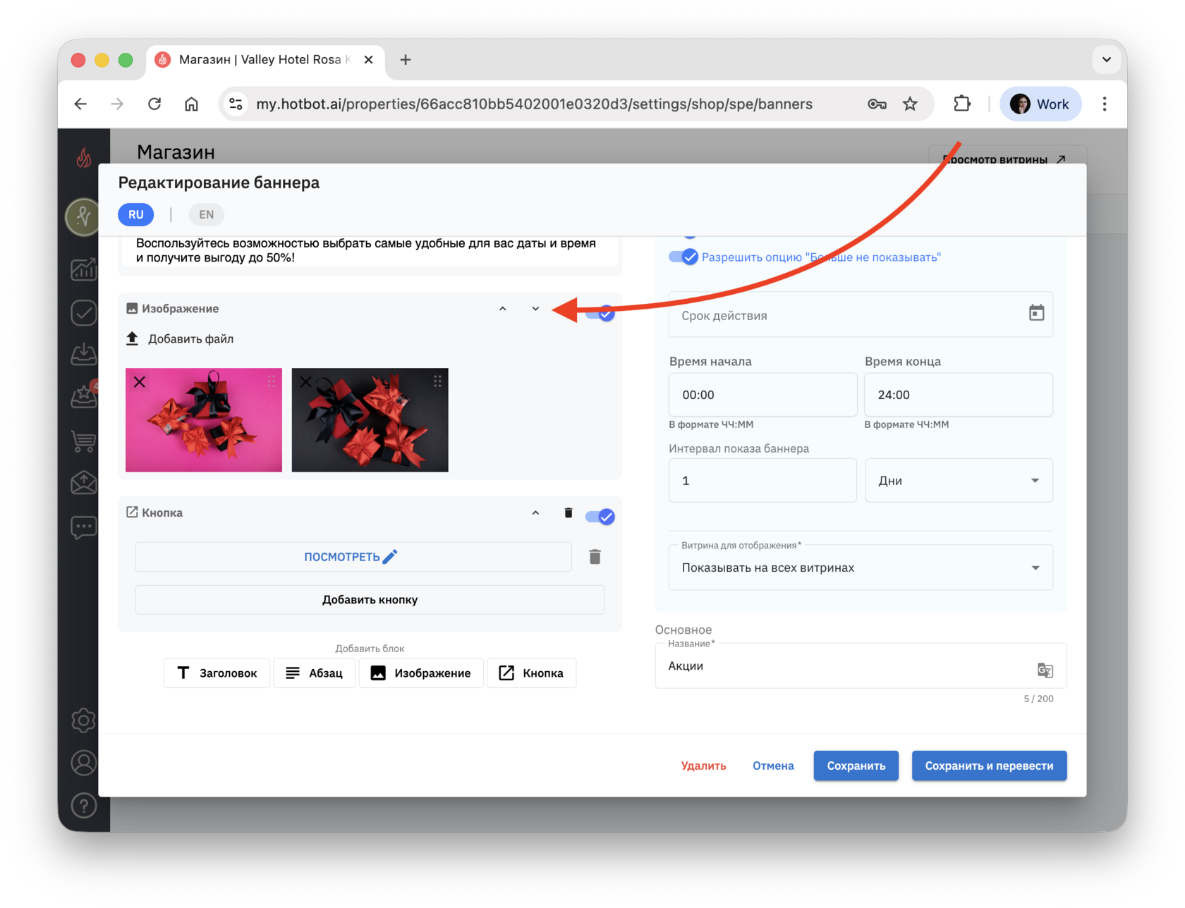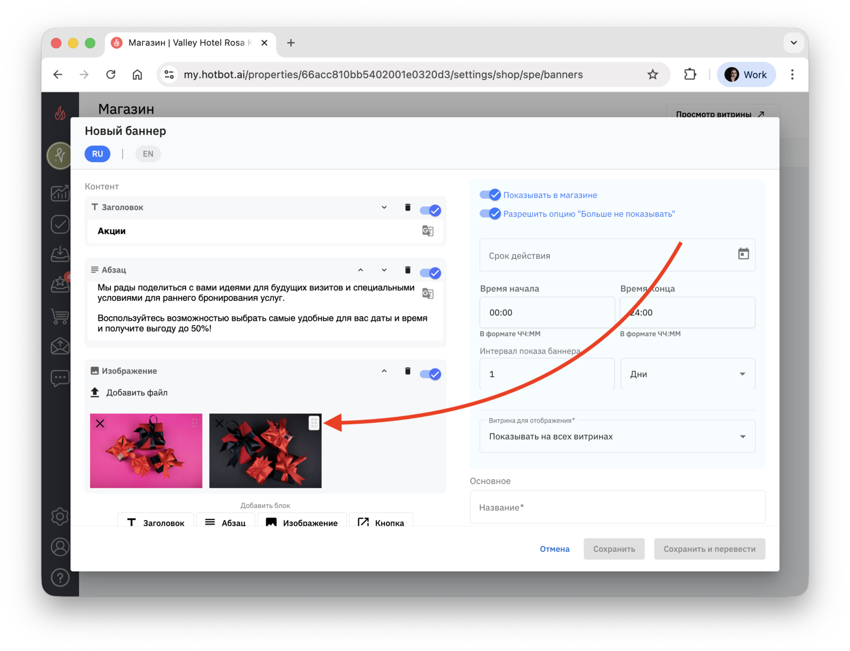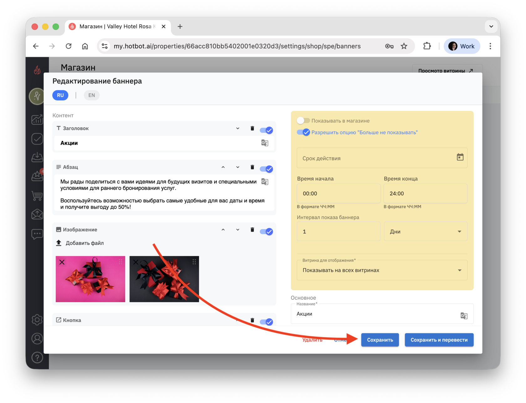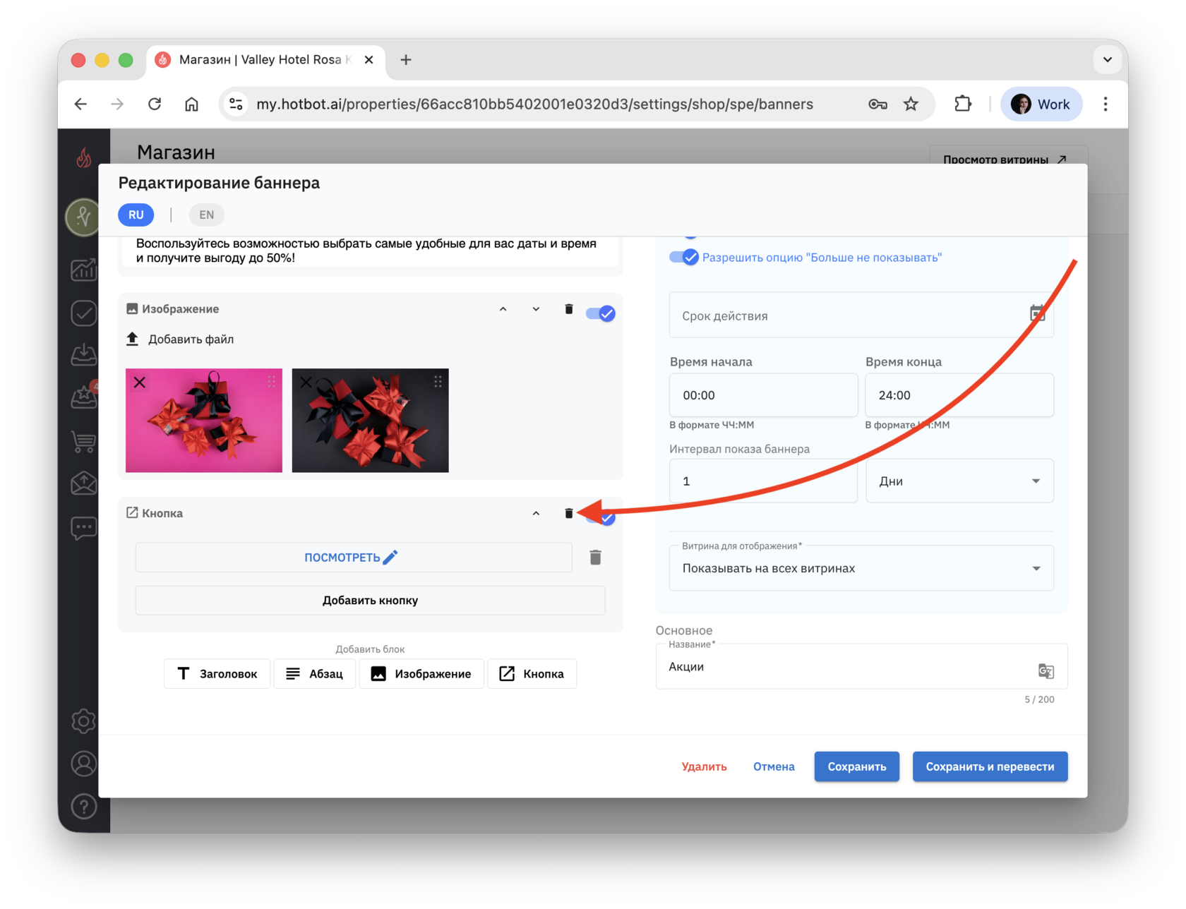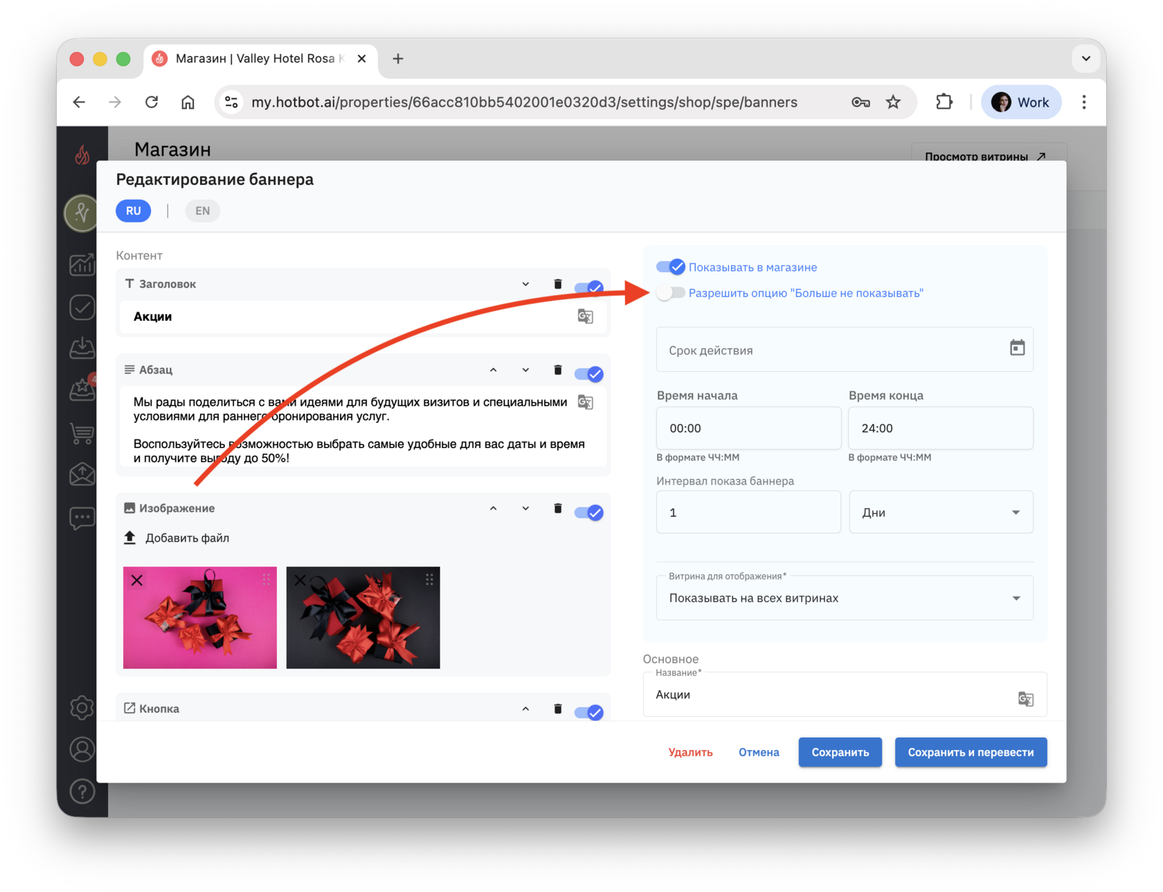 Чтобы временно скрыть баннер без его удаления, в окошке редактирования нажмите на переключатель Показывать в магазине в правом верхнем углу.