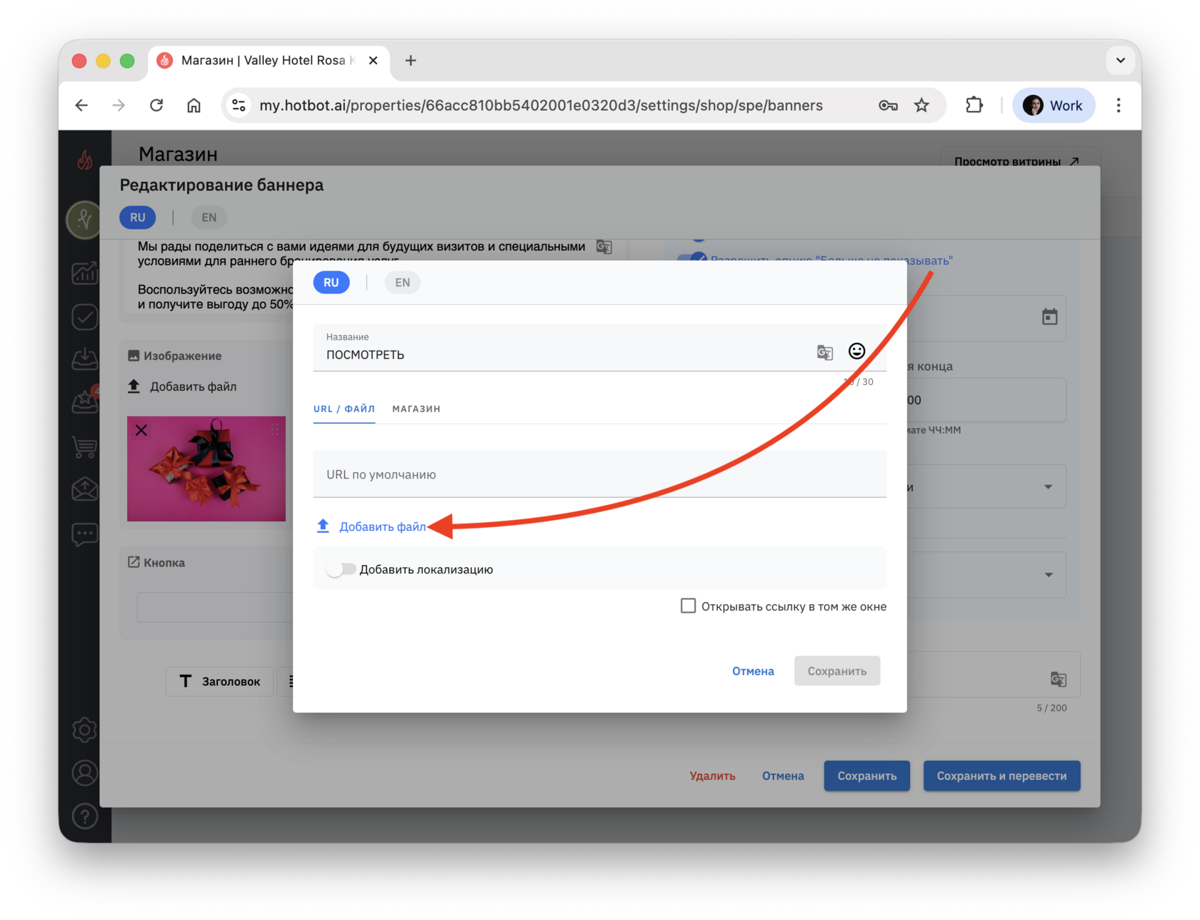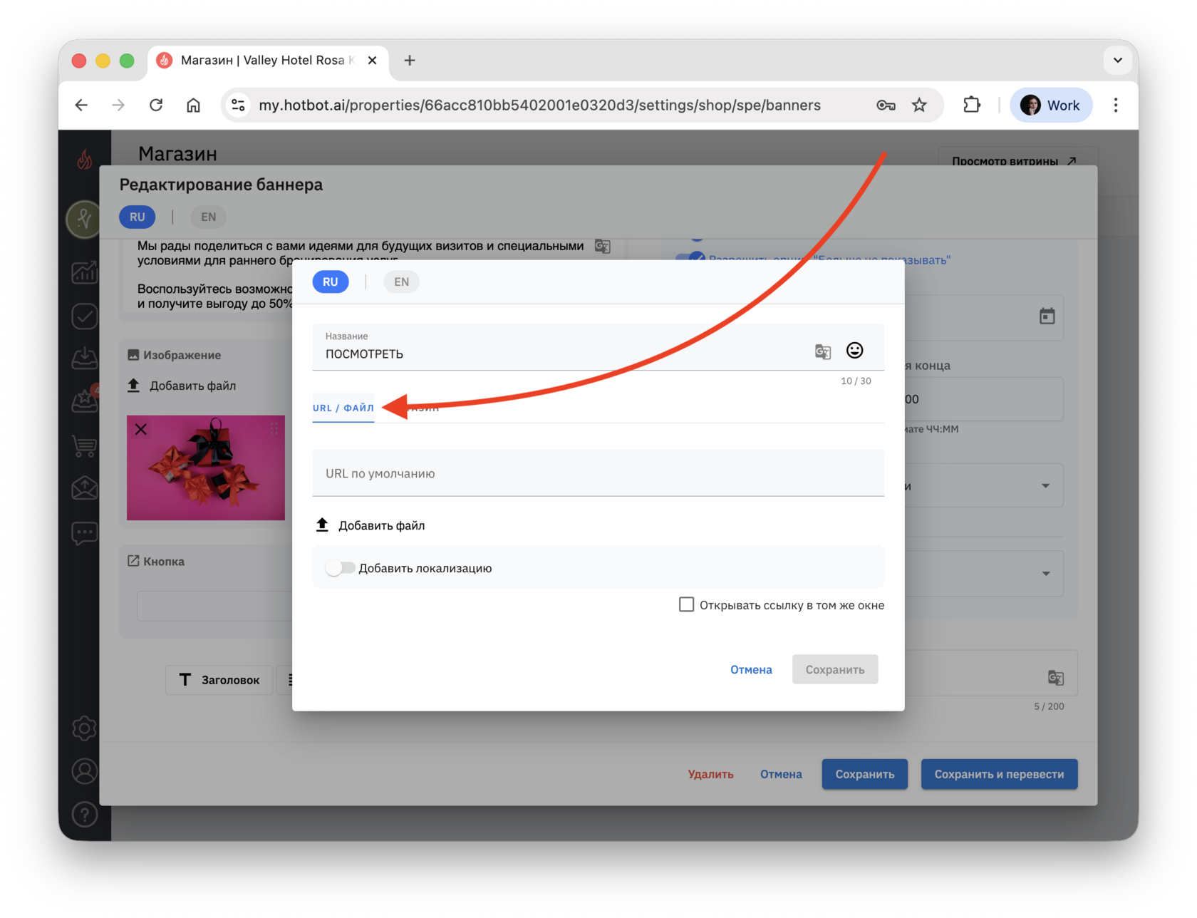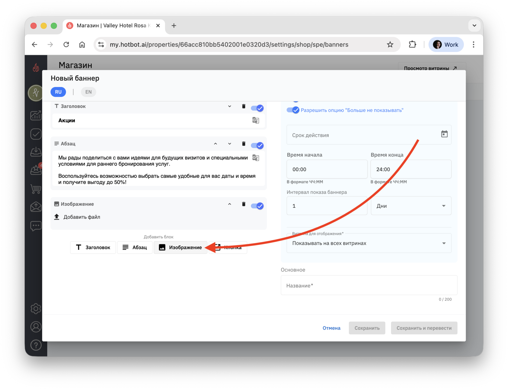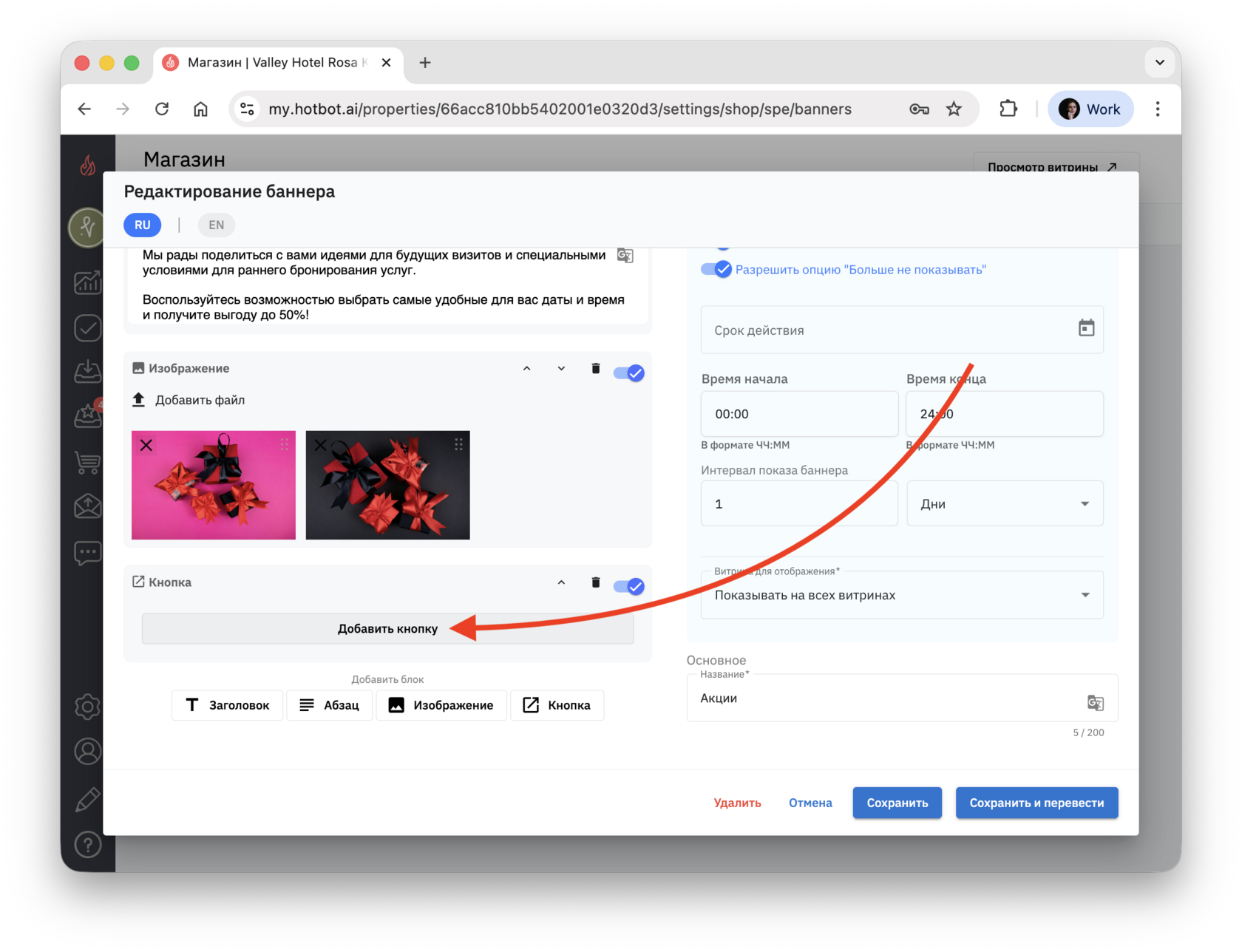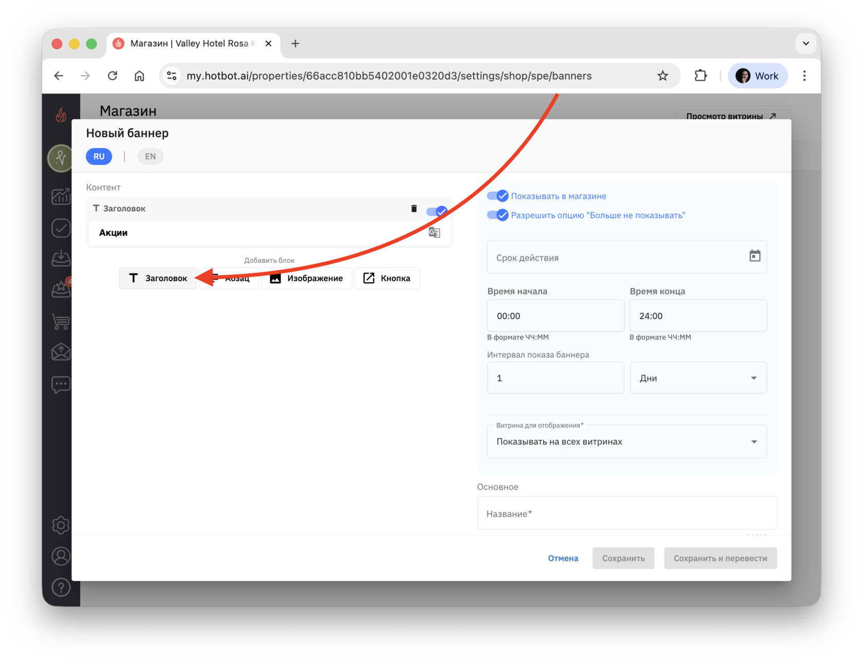 Чтобы временно скрыть баннер без его удаления, в окошке редактирования нажмите на переключатель Показывать в магазине в правом верхнем углу.