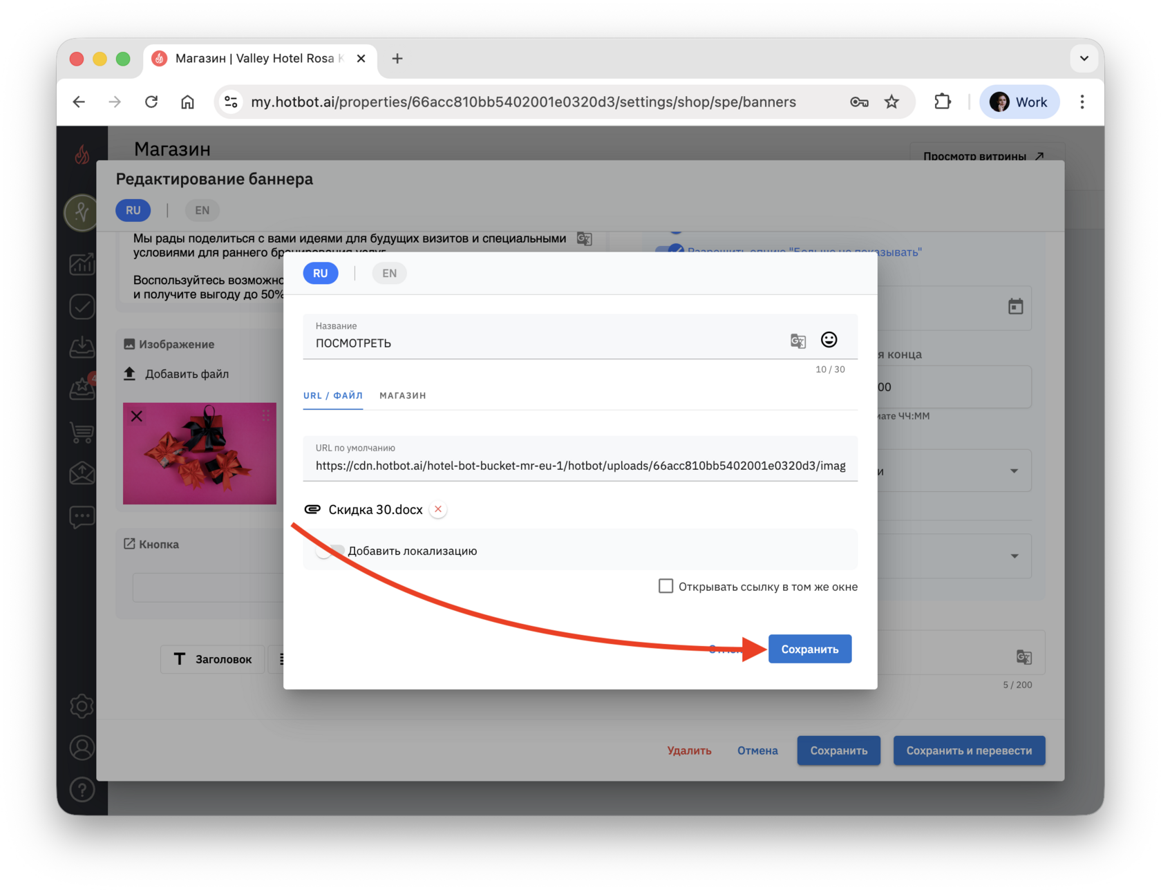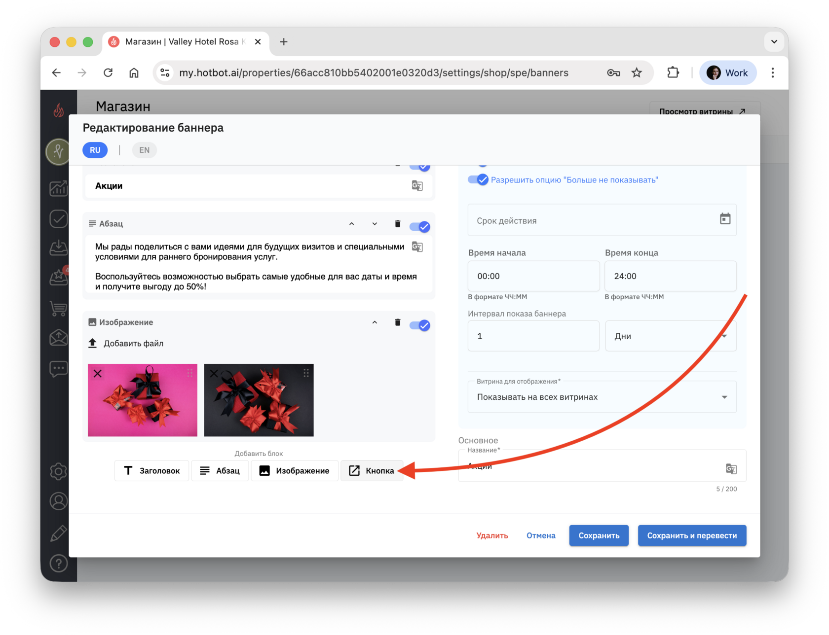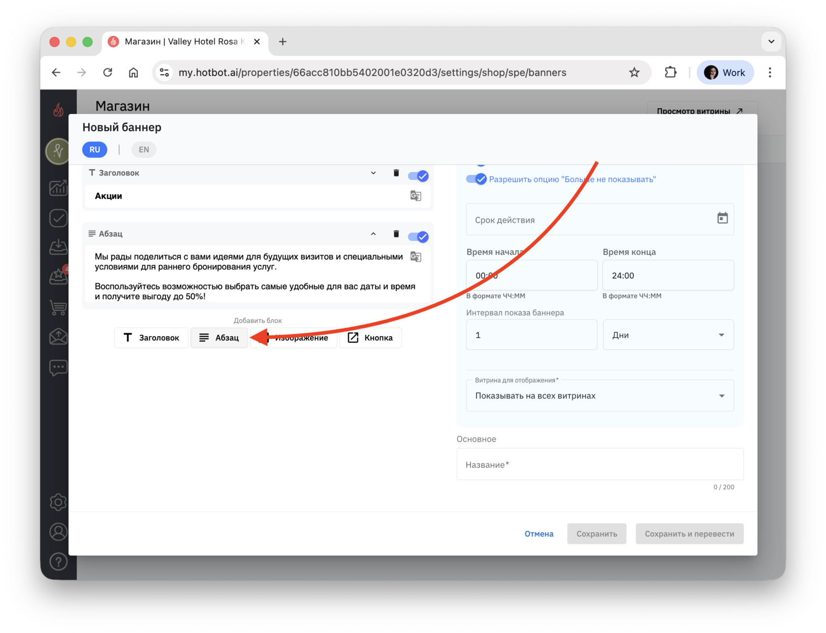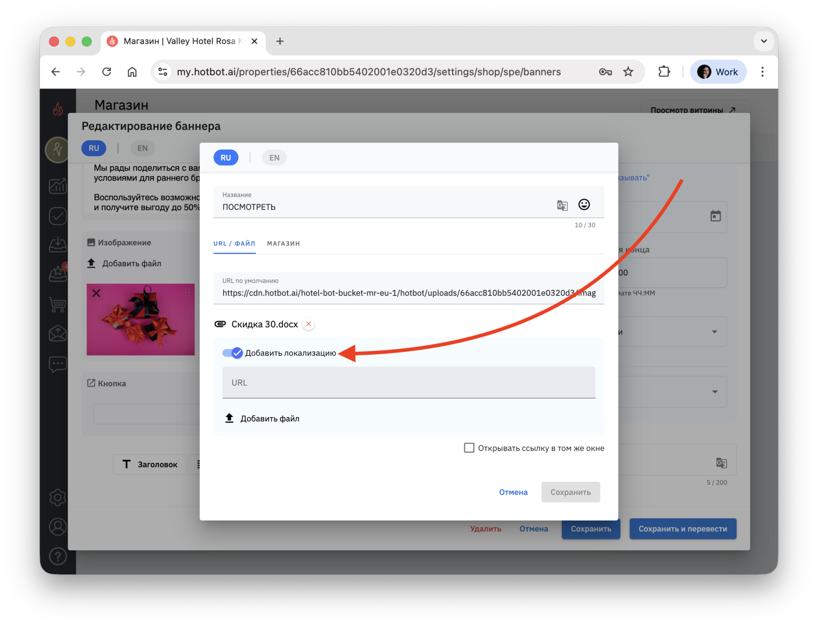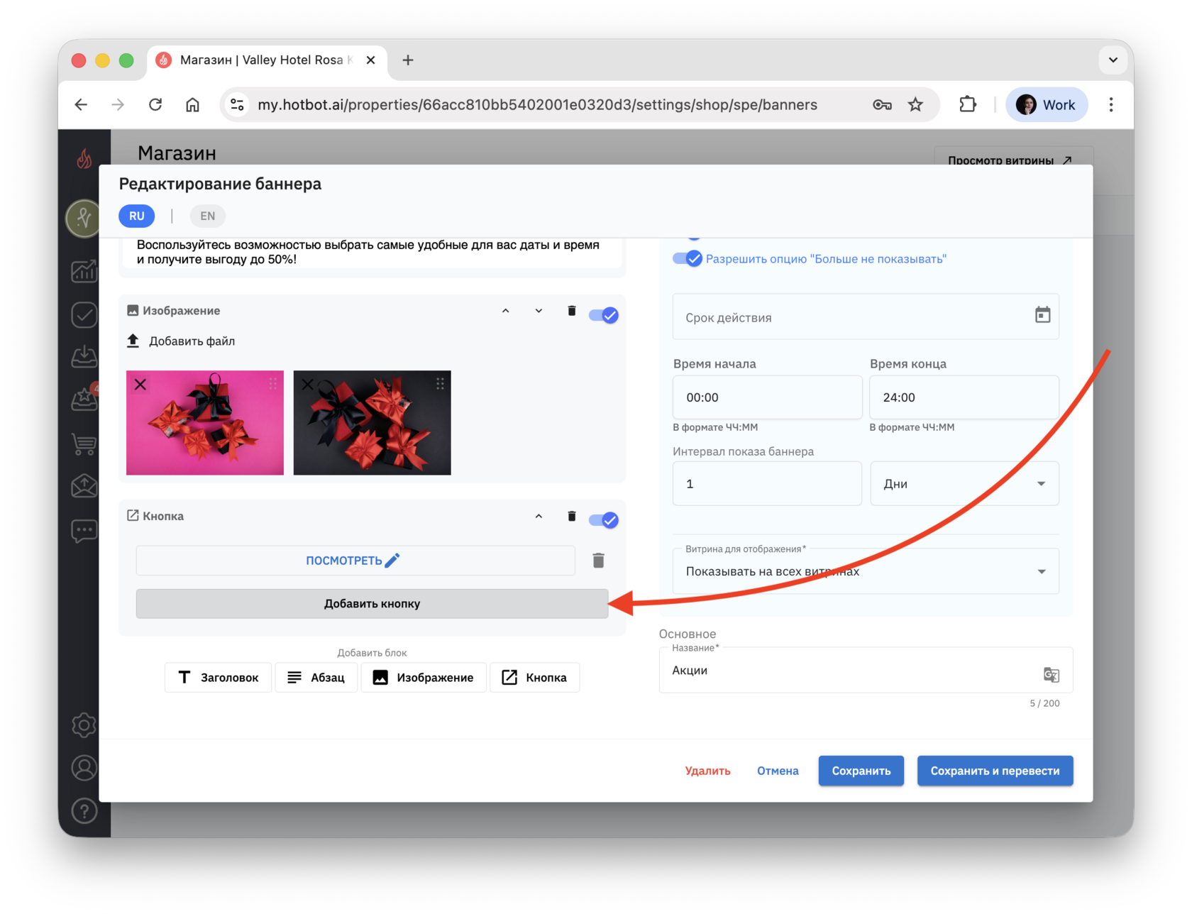 Чтобы временно скрыть баннер без его удаления, в окошке редактирования нажмите на переключатель Показывать в магазине в правом верхнем углу.