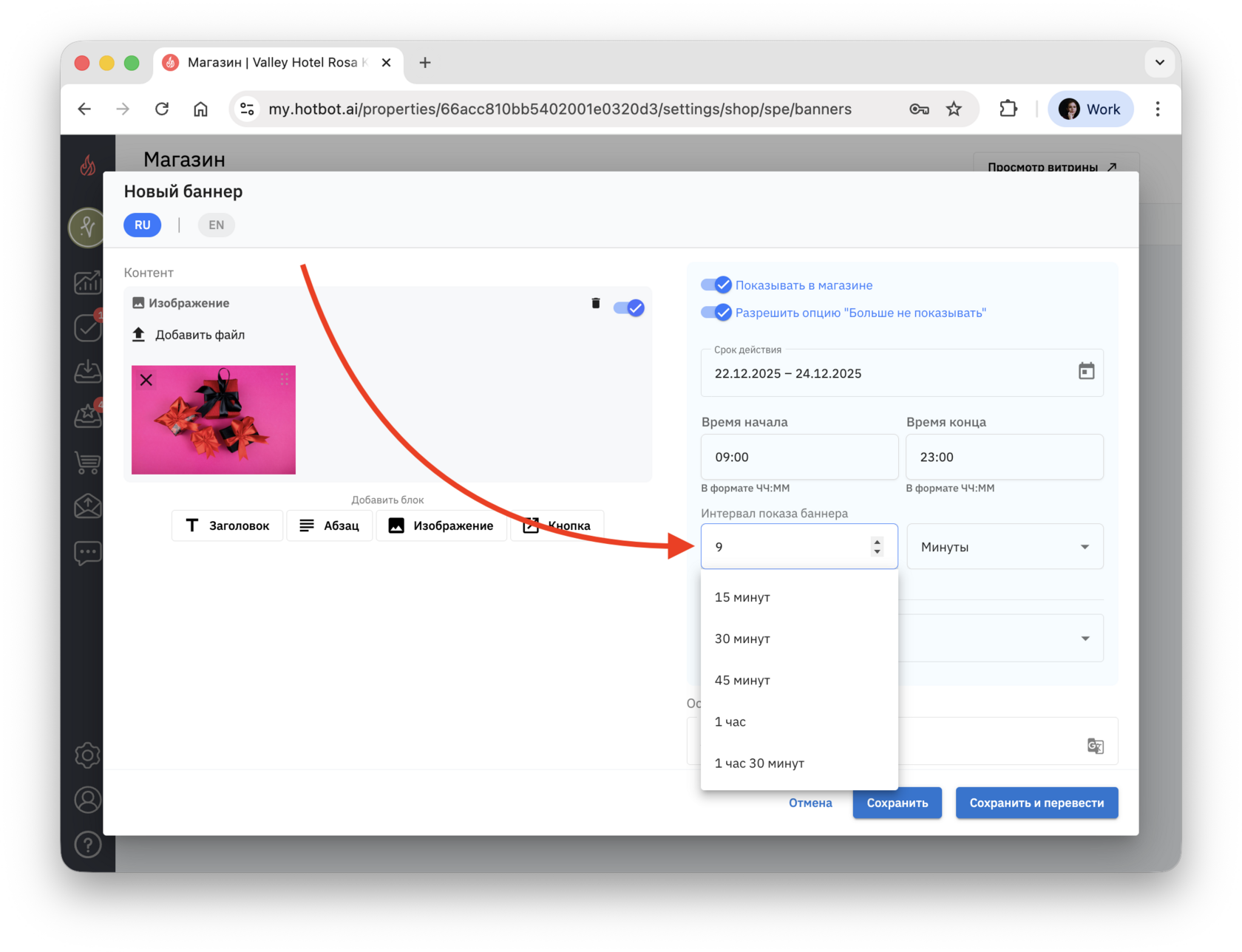 Например, если интервал показа баннера — 9 минут, то после нажатия на кнопку Скрыть на витрине баннер снова появится через 9 минут.