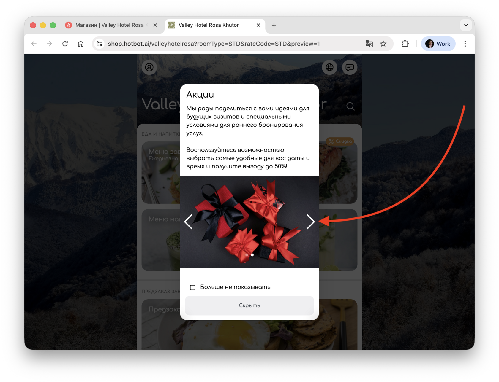 Когда баннер появляется на витрине, гость может нажать кнопку Больше не показывать, затем Скрыть. После этого баннер не будет отображаться до конца сеанса.