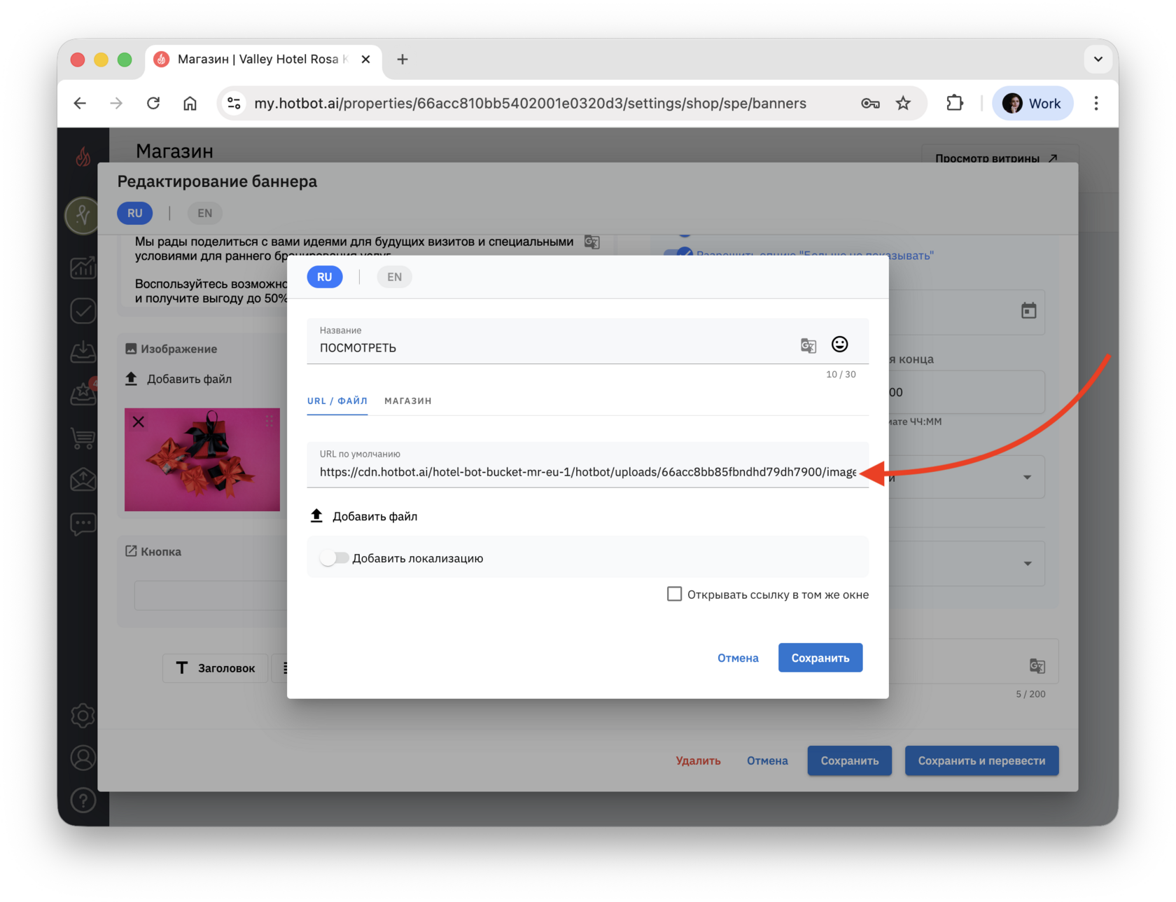 4. После загрузки файла ссылка в поле URL появится автоматически.