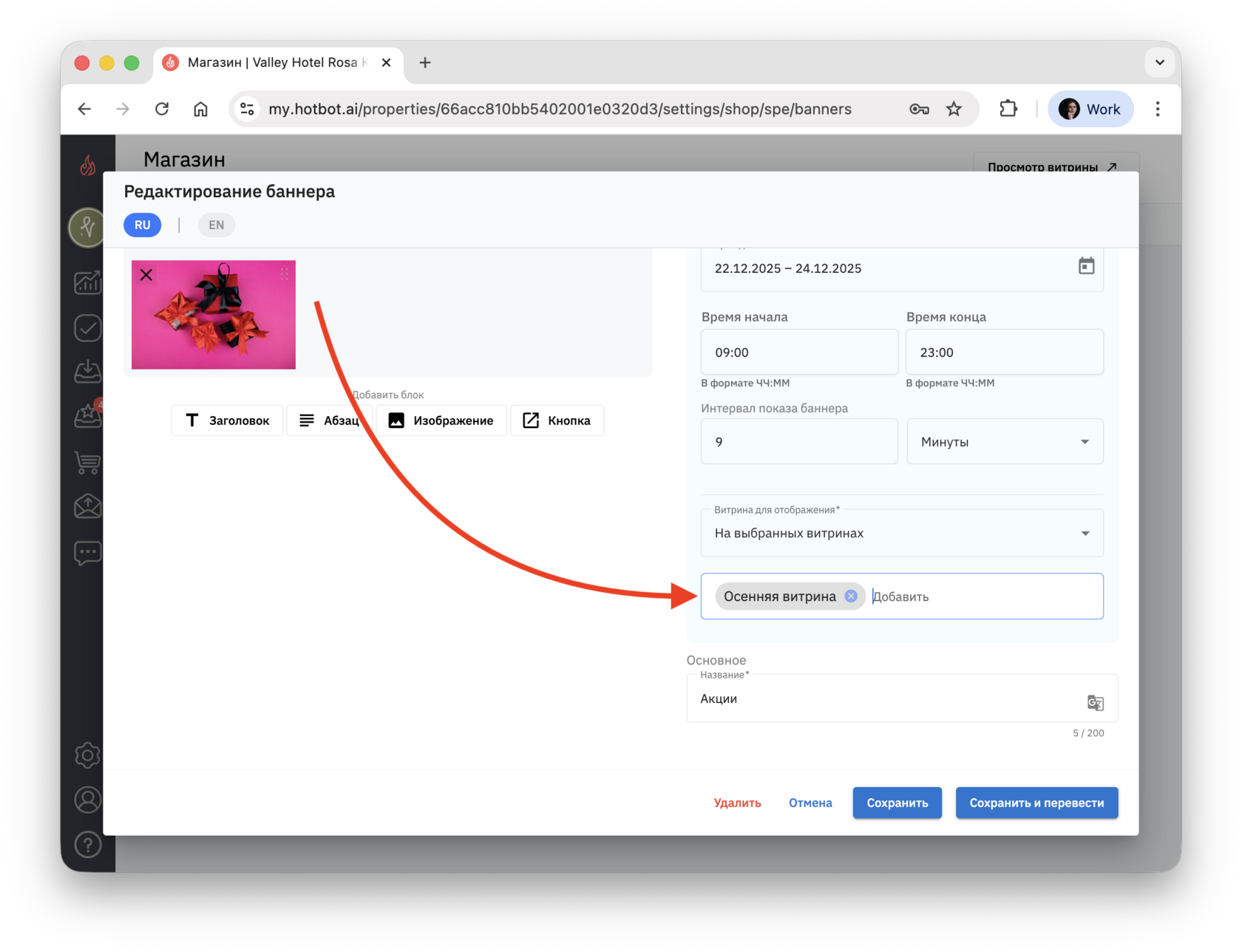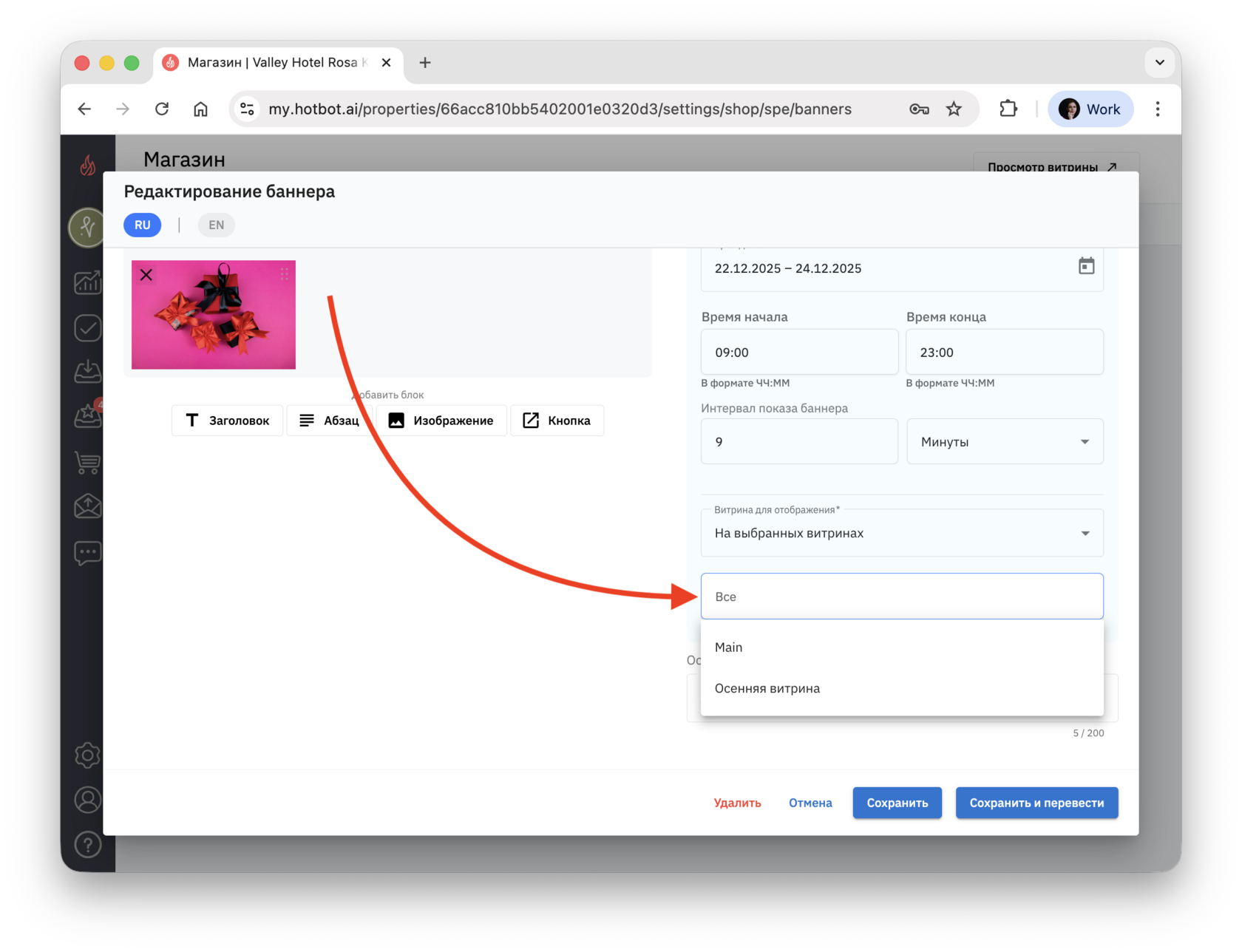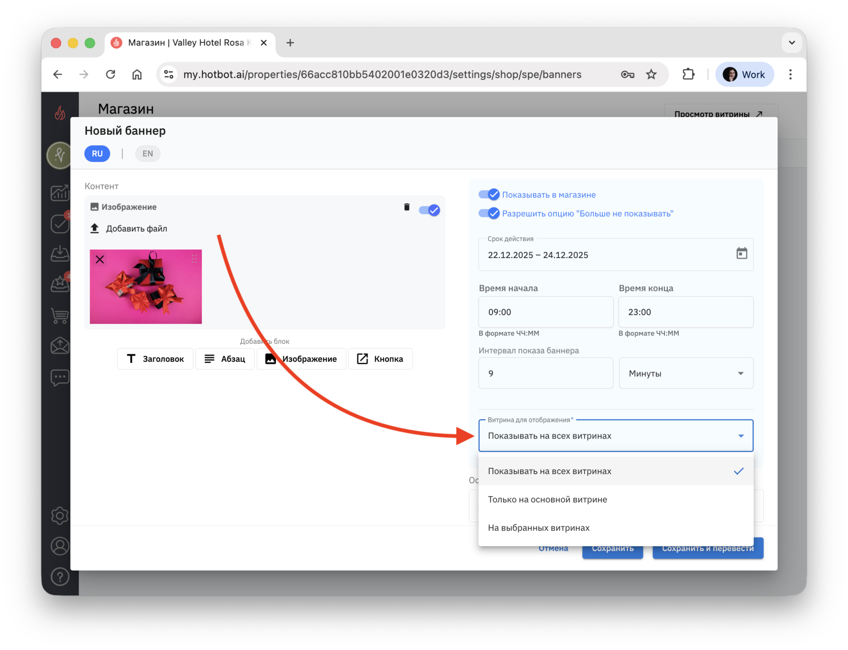 Если в магазине несколько витрин, вы можете указать, на каких витринах будет отображаться ваш баннер. Это позволяет показывать релевантные баннеры только тем гостям, для которых они предназначены.