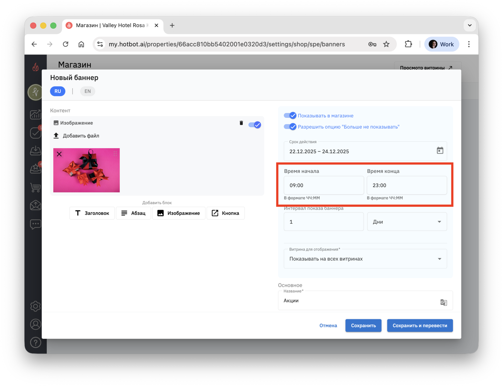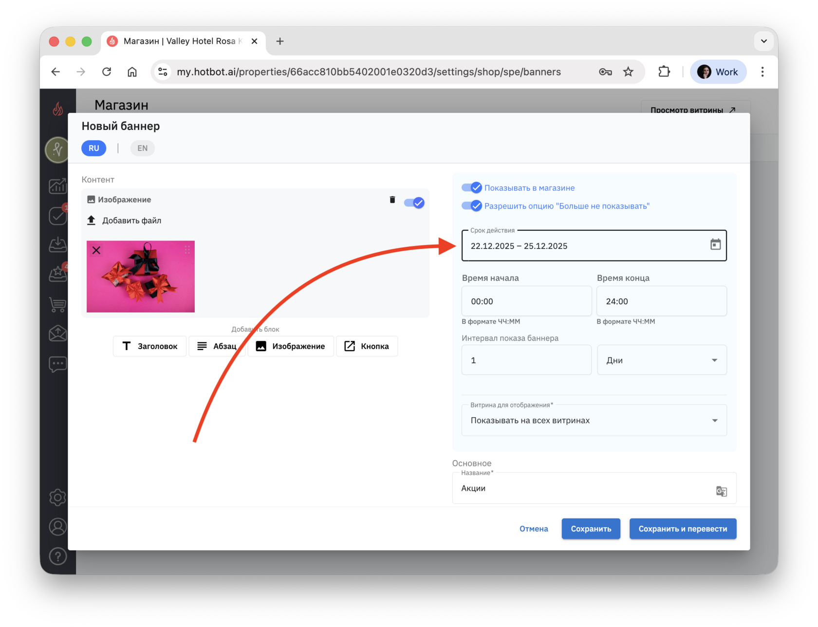 Период, в течение которого баннер будет отображаться на витрине. По истечении срока он скрывается автоматически.