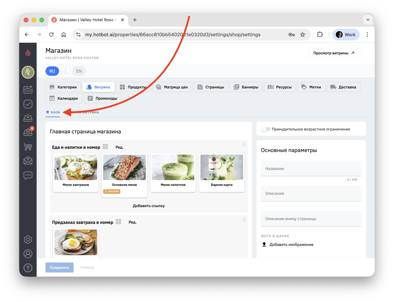 Основная витрина отмечена значком ★ на вкладке Витрина.
