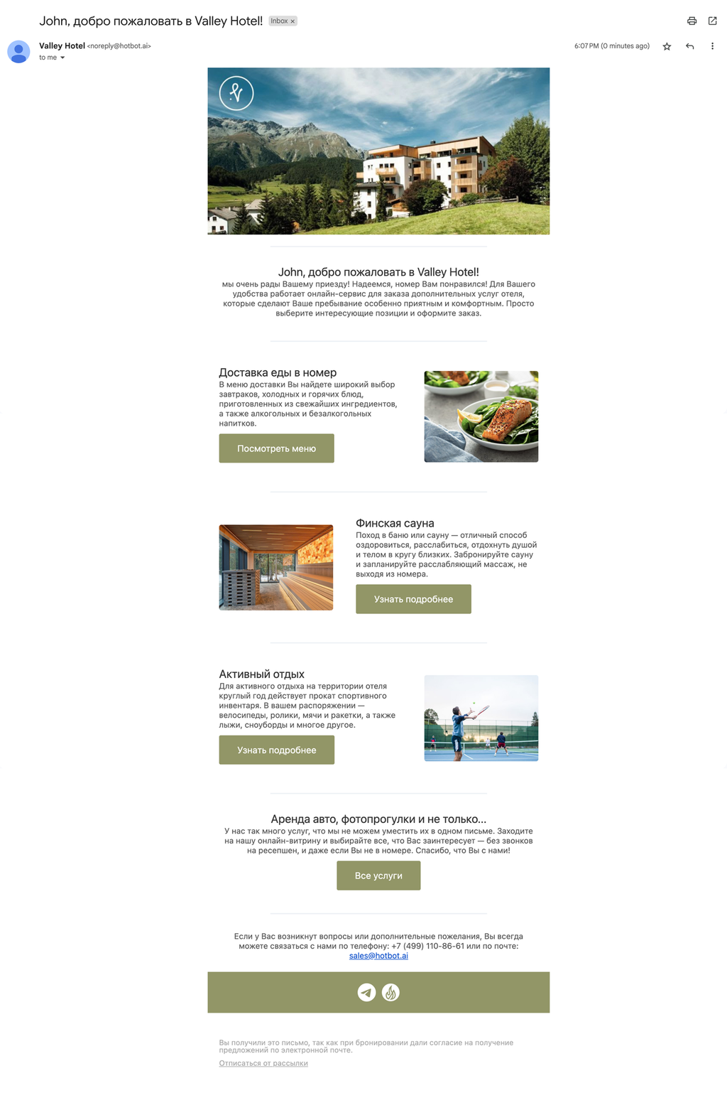 - Карточки с полезными и актуальными услугами (предзаказ завтраков, трансфер, SPA и т.д.);