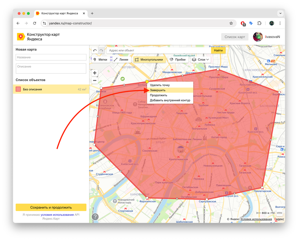 5. После того, как вы нарисовали нужную область, нажмите на первую отмеченную точку и нажмите Завершить