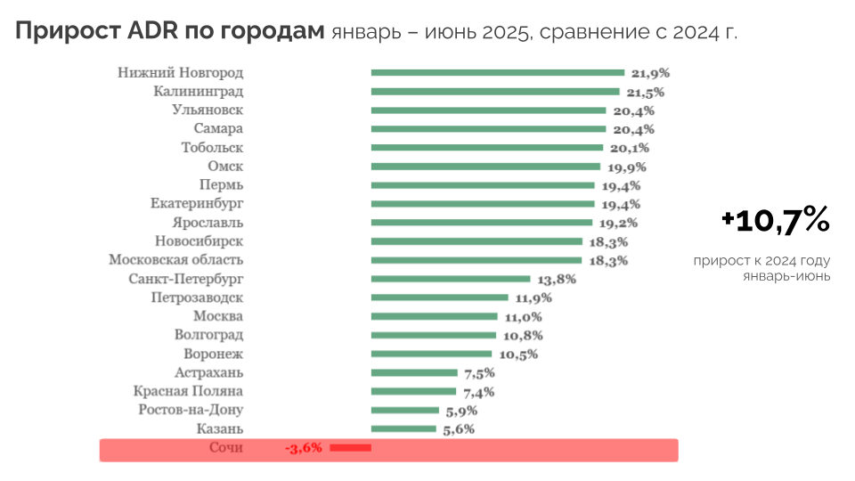 1. С начала 2025 года рост средней цены за номер (ADR) сохраняется, но прослеживается тренд на сокращение темпов прироста. В первом полугодии 2025 года средний рост цен по городам России составил около 11%. В аналогичном периоде 2024 года показатель достигал 22%, т.е. темпы прироста