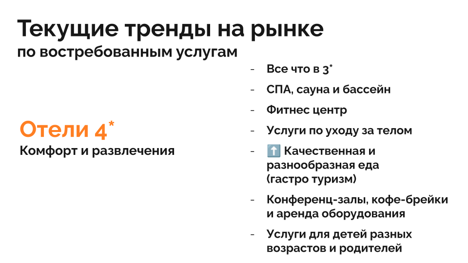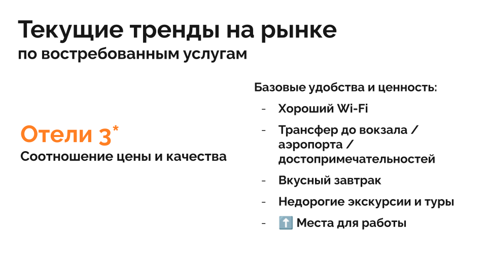 Отели должны гибко подстраиваться под потребности такого гостя — туриста и делового путешественника в одном лице. Например, в отелях 3* появились места для работы. Это обязательно нужно отмечать на сайте и выделять при бронировании для блейжер-сегмента.