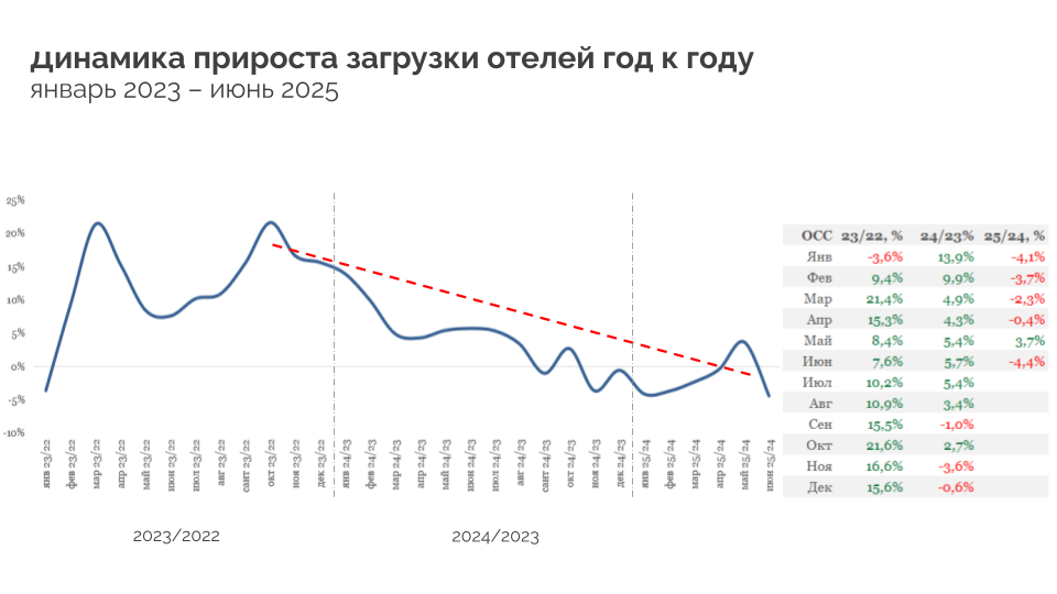 - Загрузка отелей снижается. Большинство объектов показывают результаты ниже уровня прошлого года.