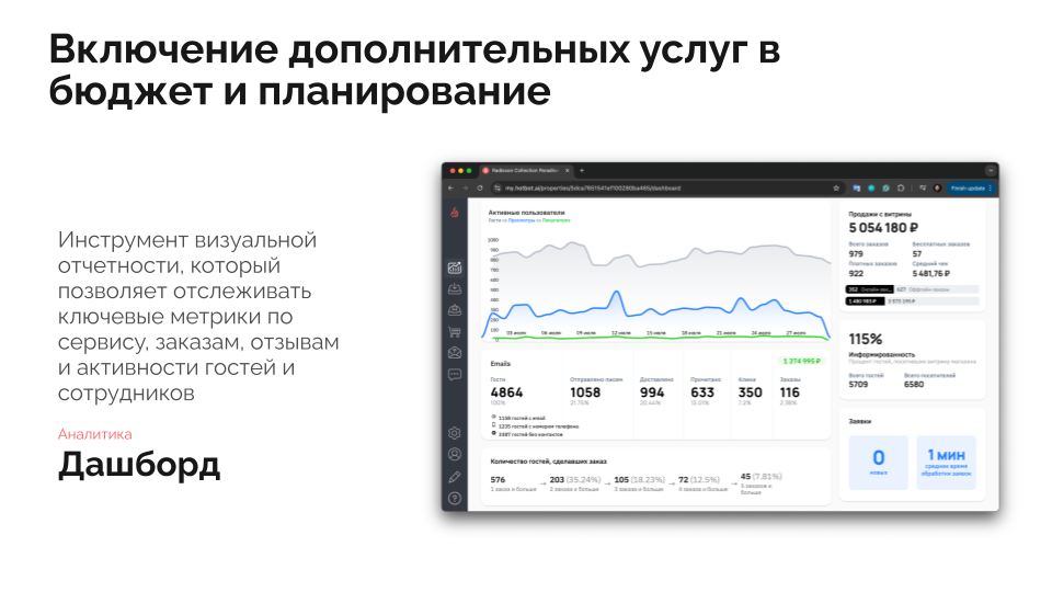 Для его проведения можно использовать Дашборд Хотбот. Инструмент дает четкую картину того, как гости взаимодействуют с вашим отелем. Вы видите реальную статистику — сколько людей заказывают румсервис, посещают спа или пользуются другими услугами. Кроме того, вы понимаете, откуда приходят бронирования — через сайт, агрегаторы, соцсети или по прямым звонкам.