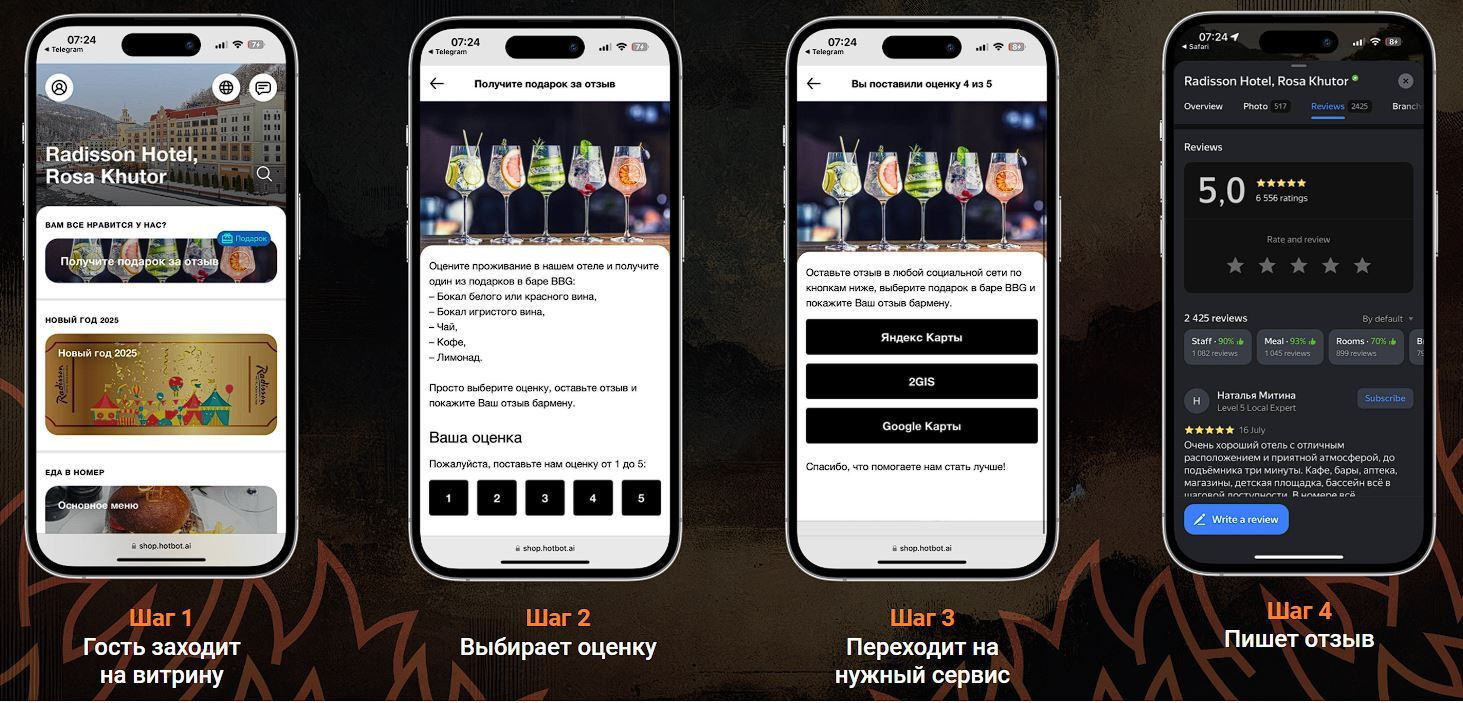 Radisson Hotel и Rosa Khutor хотели поднять рейтинг на картах и в отзовиках. Для этого настроили сбор отзывов через онлайн-витрину услуг. Гость ставит оценку в пару кликов: высокие оценки уходят на внешние площадки, низкие — во внутренний канал, где с ними работает команда. За первый месяц отзывов стало в 2 раза больше, а рейтинг на Яндекс.Картах вырос до 5 баллов.
