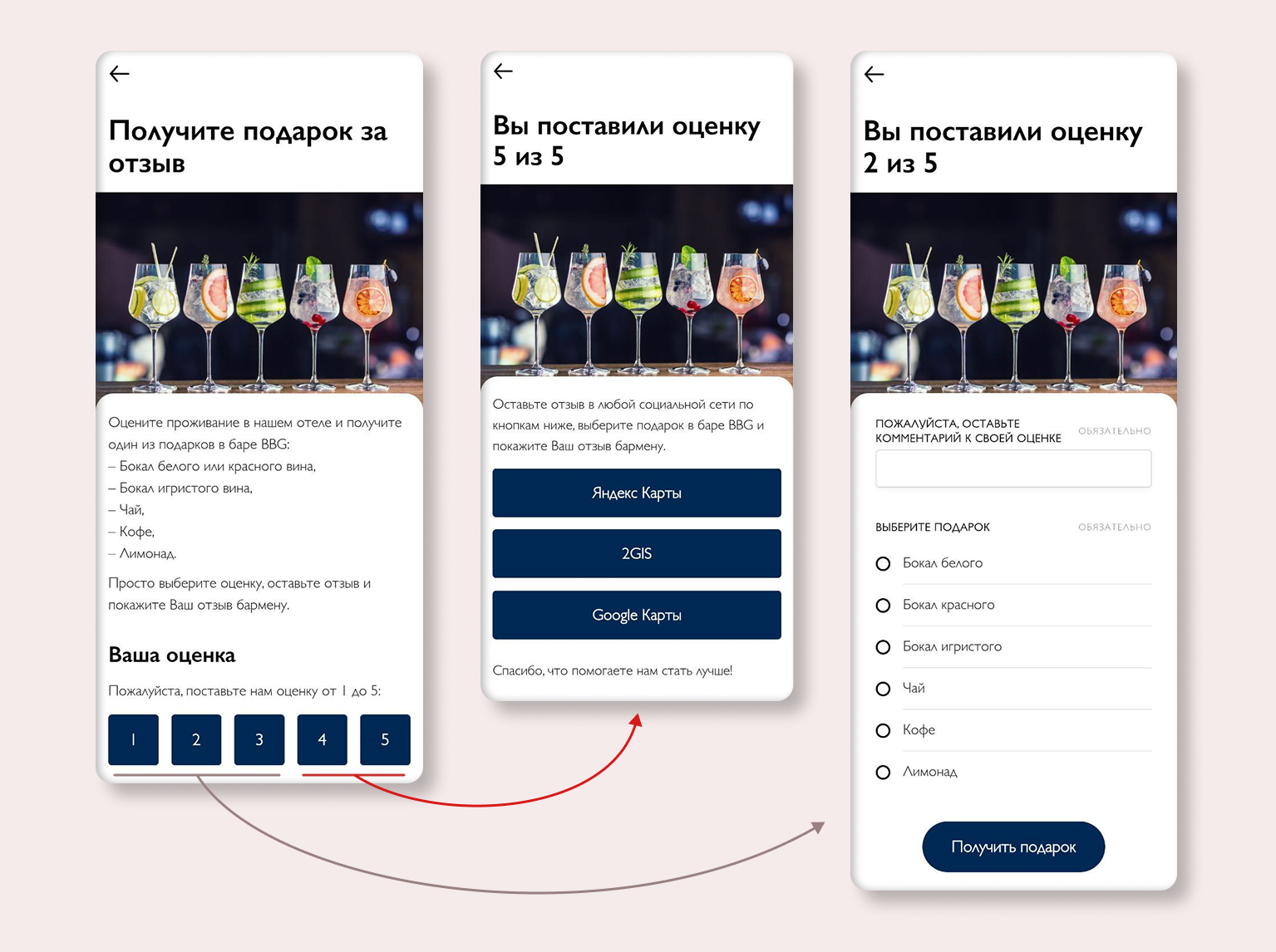 Гость получает вкусный подарок в баре после отзыва. Бар получает дополнительный трафик.