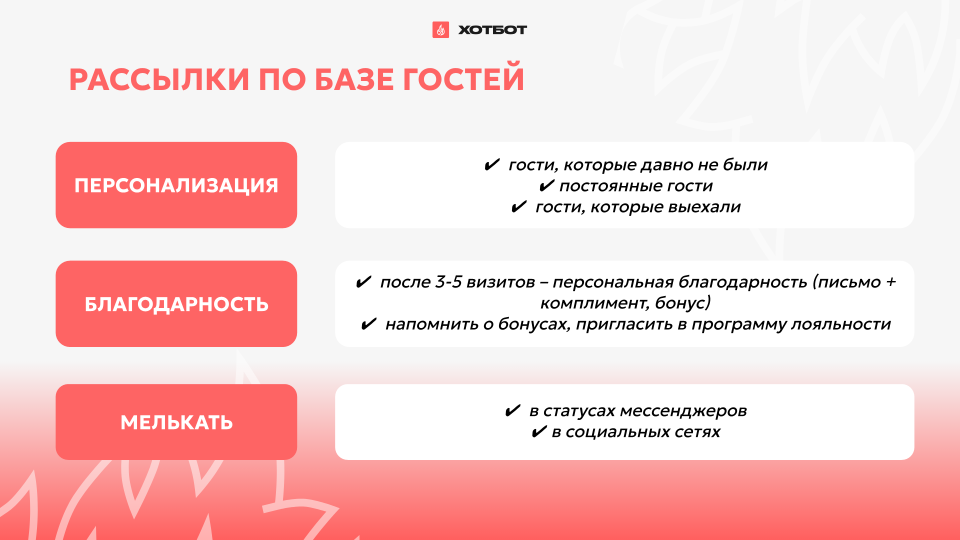 - Отслеживайте отклики: сколько гостей вернулись после рассылки, какие предложения чаще используют.