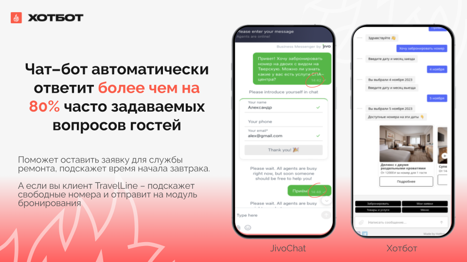 Если хотите поднять продажи и освободить персонал от 80% рутинных задач — узнайте, как чат‑бот и умные рассылки помогут вашему отелю автоматизировать обработку запросов, увеличить количество бронирований и сократить время на стандартные операции. Запишитесь на консультацию с экспертом Хотбот — мы проанализируем особенности вашего отеля и покажем, как внедрить решения под ваши задачи.